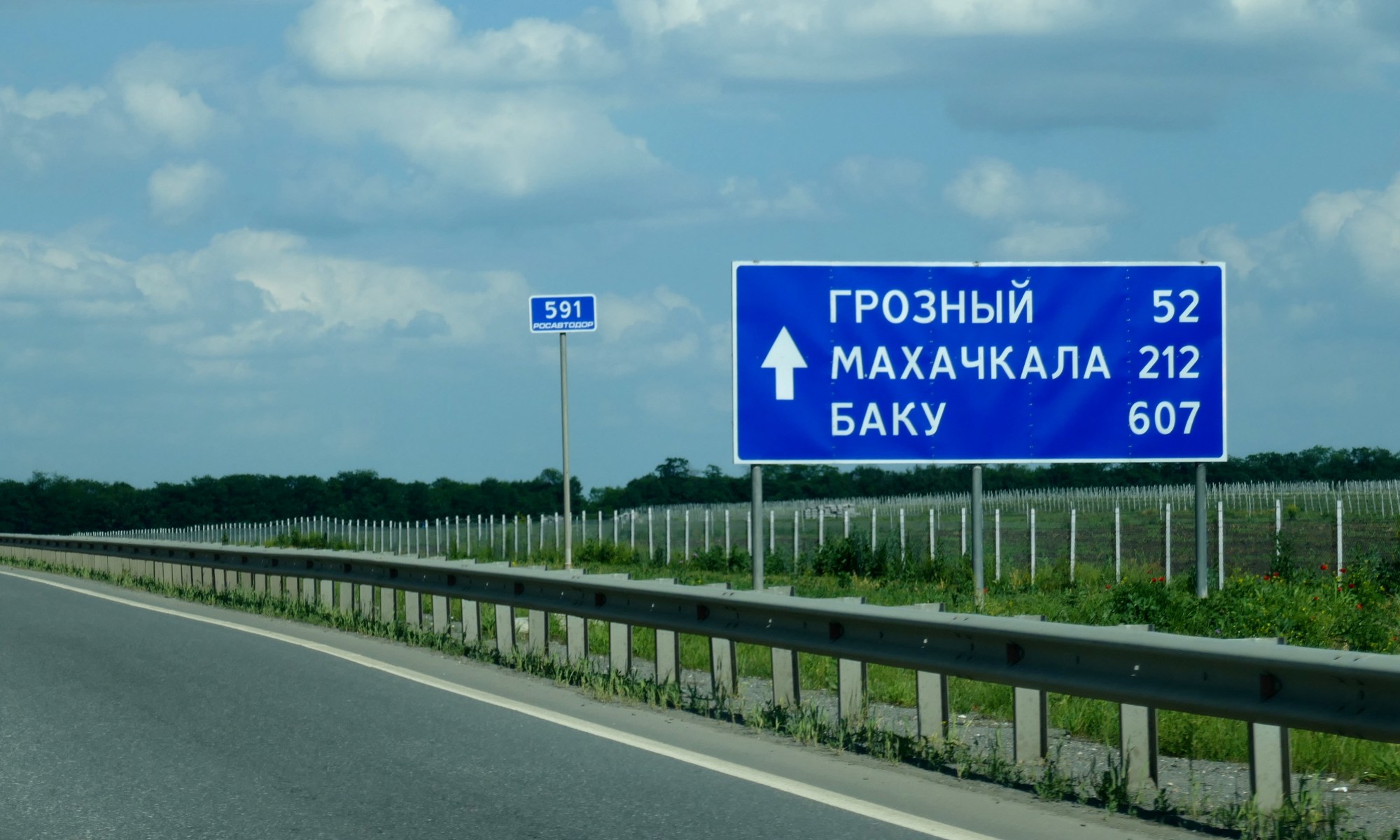 Road sign on the Caucasus Magistrale telling the distances to Grozny (Chechnya), Makhachaka (Dagestan) and Baku (Azerbaijan)