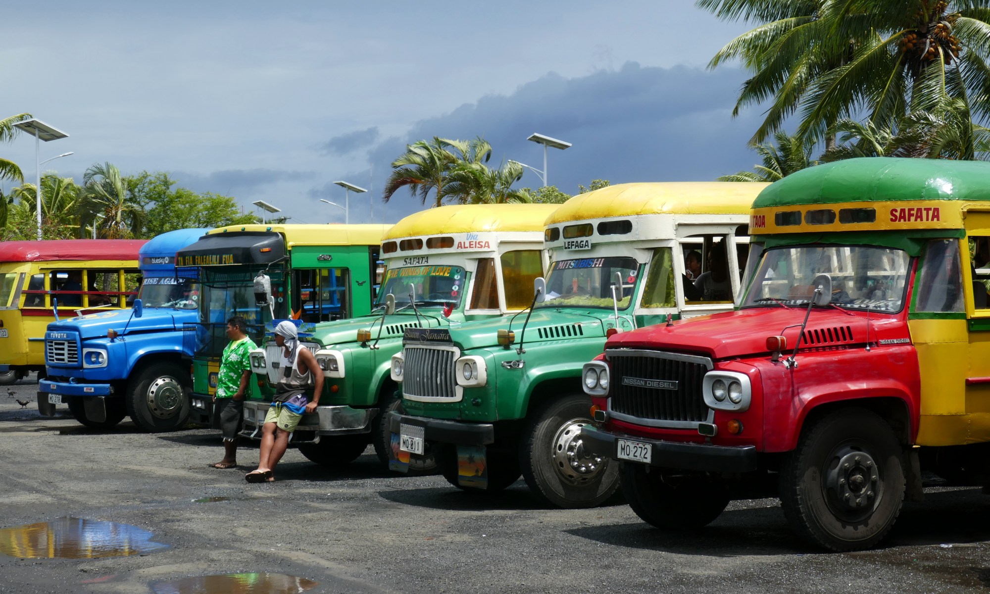 - Samoa’s busses are colourful and loud, a bit similar to Kenya’s matatus. Many feature a theme and a corresponding painting job, mostly airbrush. The sound systems are deafening and a few rides acquaint you with the current Samoan pop charts. Despite their badass appearance, the slogans painted on the busses are the likes of “Samoa is founded on god” or “Obey the law!” The impressive exterior of those busses serves to cover the lack of comfort: They are slow, the benches made of wood, and they are often so packed that people sit on each other’s lap.