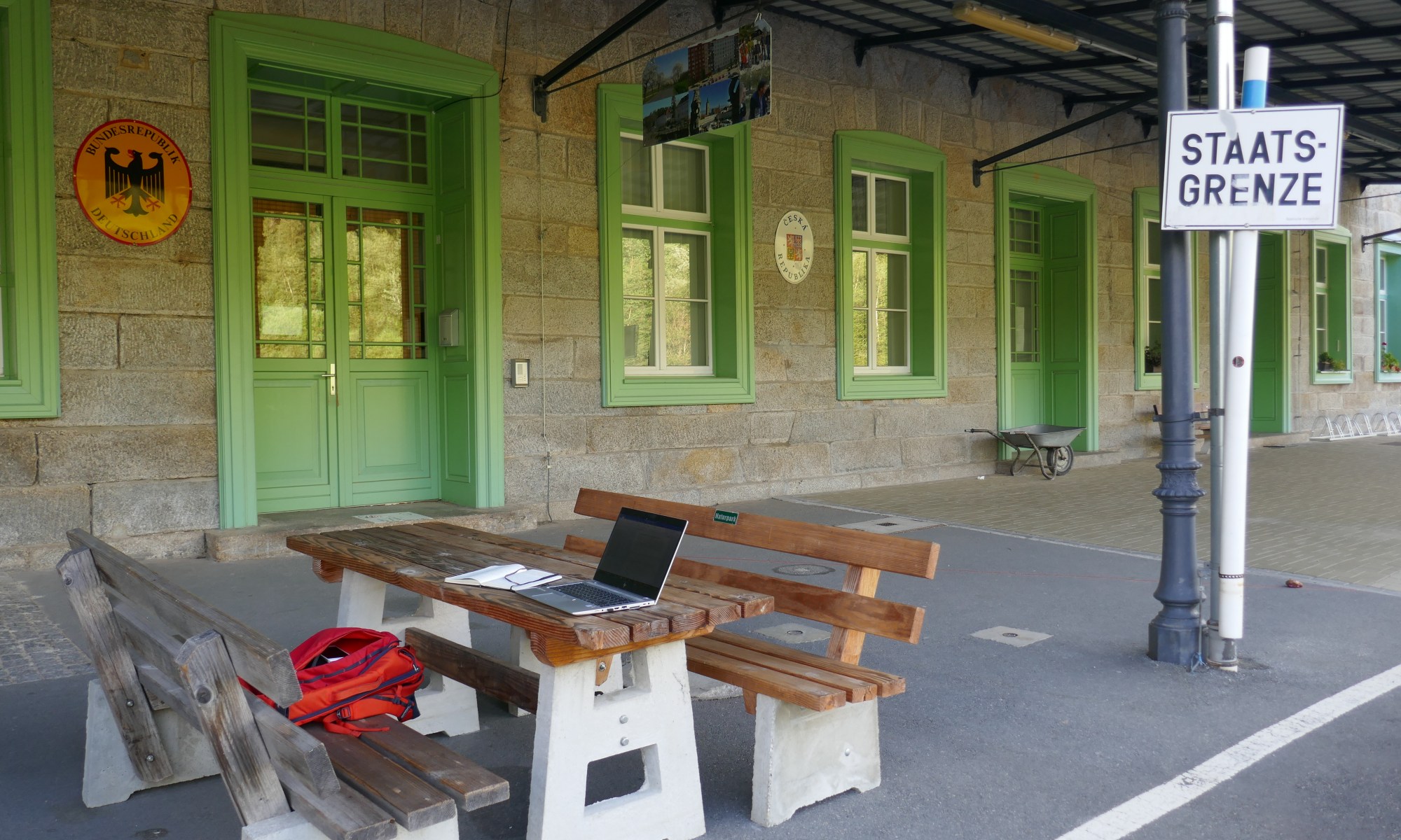 Der Grenzverlauf auf dem Perron. Der Tisch im Vordergrund gehört zu Deutschland, die grosse Tür dahinter schon grösstenteils zu Tschechien. Ich nutzte den Tisch als einzigartigen Arbeitsplatz für mein Buchprojekt zu interessanten Grenzübergängen. Später parkierte ein kleiner tschechischer Lastwagen gleich neben mir und zwei Männer begannen, Möbel aus dem Raum hinter der Tür zu verladen. Hörten dazu tschechisches Radio und befanden sich auch in Tschechien, hatten aber kaum die 2m Corona-Abstand zu mir.