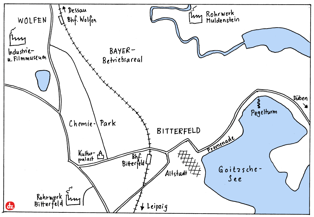 Der «Chemiepark Bitterfeld-Wolfen» macht darum trotz seines vielversprechenden Namens keinen herunterkommenen Eindruck. Viele Flächen stehen leer, dazwischen stehen mehrheitlich moderne Fabrikgebäude. Mitten im Industriegebiet steht der Kulturpalast und wirkt sozialistisch wie eh und je. Einfach leer, der Sozialismus ist ja vorbei. Und es gibt lustige Strassennamen wie «Östliche Stickstoffstraße».