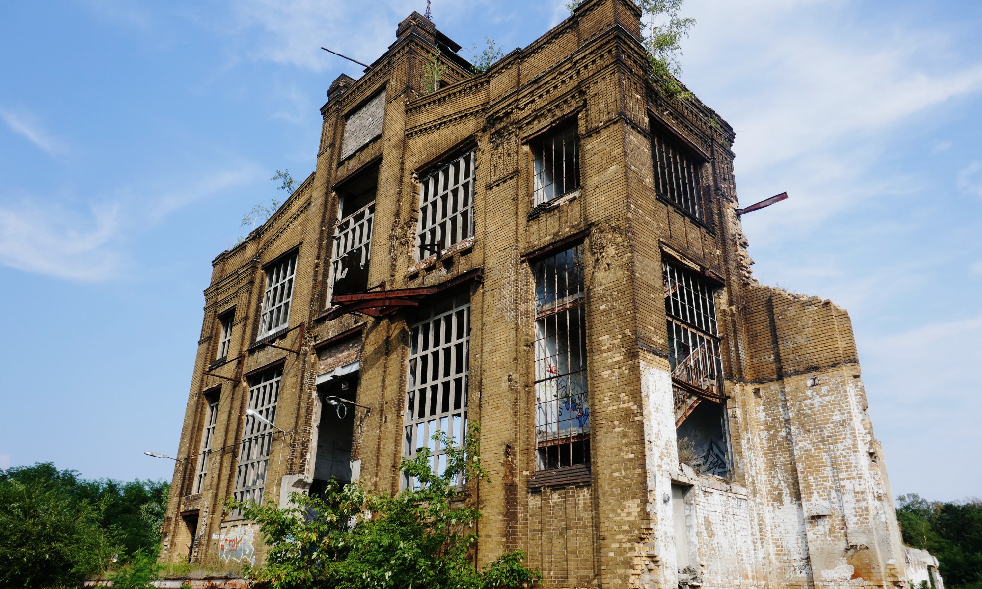 Zuerst besuchte ich die imposante Ruine des Rohrwerks Bitterfeld. Just nachdem ich den Zaun durchquert hatte, ging auf einem benachbarten Firmengelände eine Alarmanlage los. Aber sie galt nicht mir. Ich konnte mich in Ruhe und mit passenden Hintergrundgeräuschen umsehen. Eine herrliche Stätte.