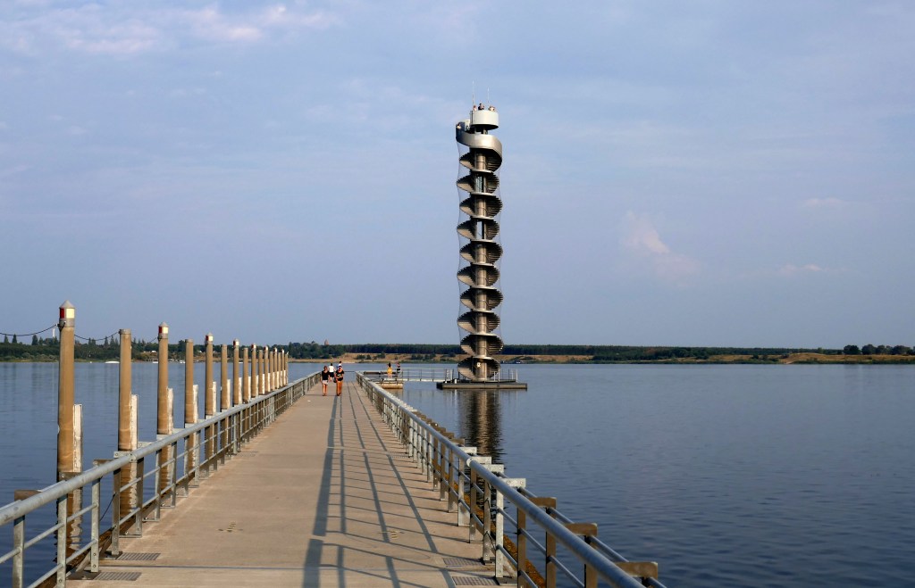 Aber Bitterfeld hat auch eine bekömmlichere Seite. Der See wertet die Stadt ungemein auf – mit Strandbar, Openair, verschiedenen Restaurants und Ausflugszielen. Wahrzeichen ist der 28 Meter hohe «Pegelturm» am Goitzschesee, eine frei stehende Wendeltreppe aus Stahl.