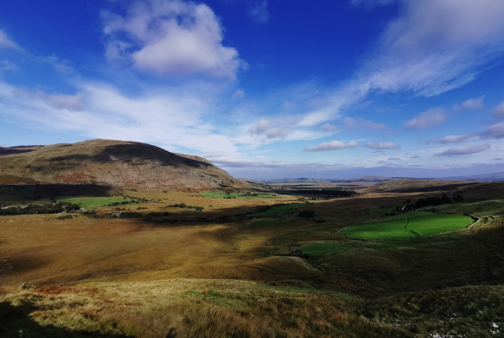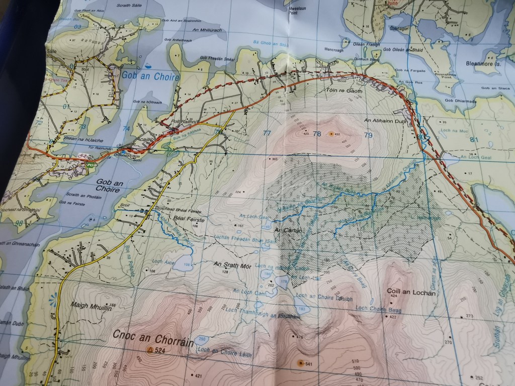 Landkarten: Irlands Ordnance Survey gibt Landkarten im Massstab 1:50000 (Discovery Series) heraus, welche die ganze Insel abdecken und auf der alle markierten Wanderwege eingezeichnet sind. Von einigen Gegenden gibt es auch Karten im Massstab 1:25000. Die Karten sind ziemlich gut, wenn auch nicht ganz auf dem Niveau von Swisstopo. Entscheidend für die Planung ist nämlich wie erwähnt die Wegbeschaffenheit, und die lässt sich nicht einfach aus der Signatur ableiten. „Other roads“ können asphaltiert sein oder Kieswege, bei den „tracks“ geht die Spannweite von Kieswegen (4-5 km/h) bis hin zu kaum passierbaren Spuren im Moor (1 km/h) und privaten Feldwegen (Zutritt verboten). Eine Wanderung auf eigene Faust zu planen ist deshalb schwierig bzw. man sollte dann wohl „tracks“ besser meiden (wie ich mittlerweile weiss) – mit dem Nachteil, dass man ständig auf Wegen unterwegs ist, die auch mit Fahrzeugen passierbar wären. Auf die meisten Berge und Hügel sind in den Landkarten gar keine Wanderwege eingezeichnet. Man kann sie dennoch besteigen, muss die Infos dazu aber online recherchieren (z.B. bei Sport Ireland oder Alltrails) und mit nassen Schuhen rechnen, da die Hügel im Westen meist moorig sind.