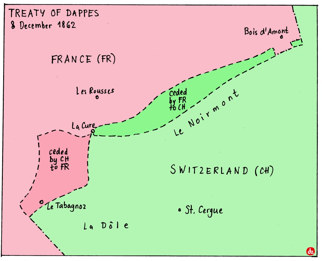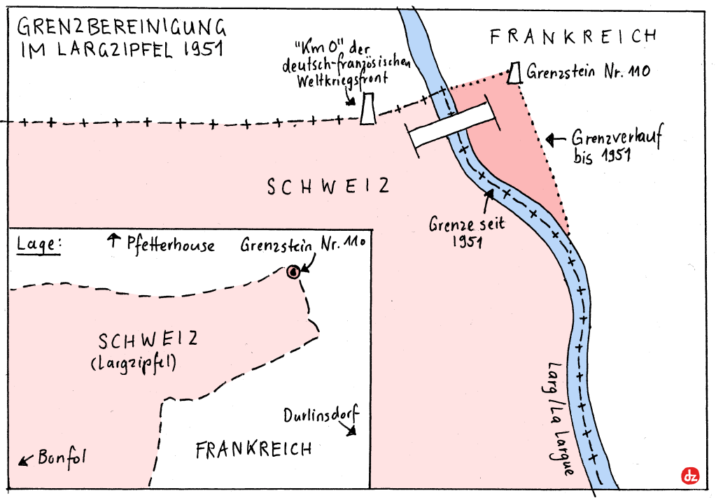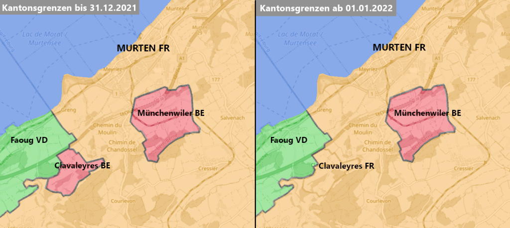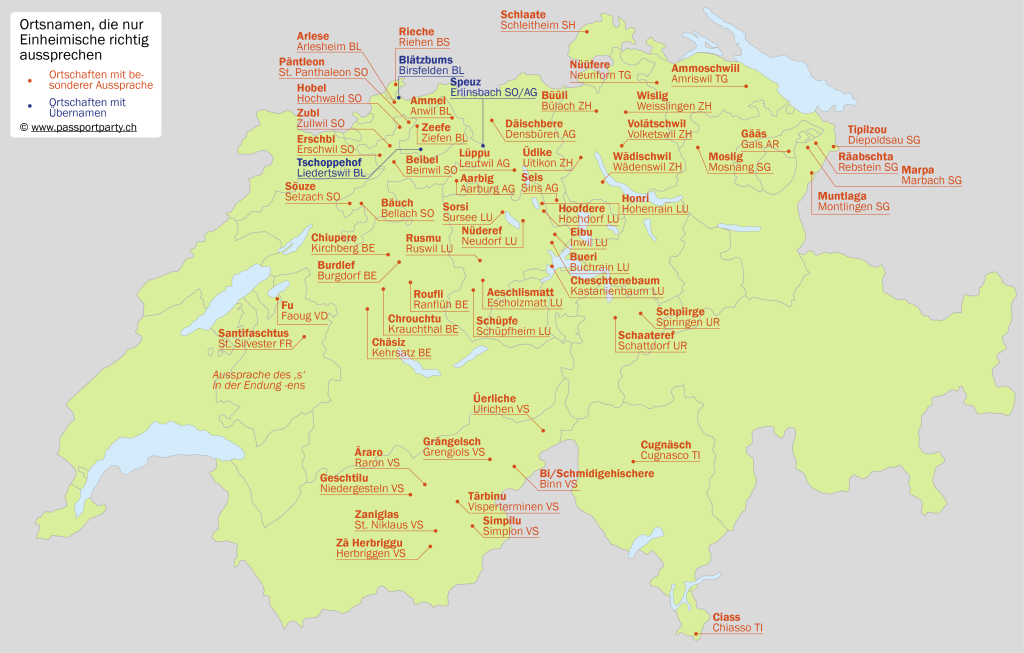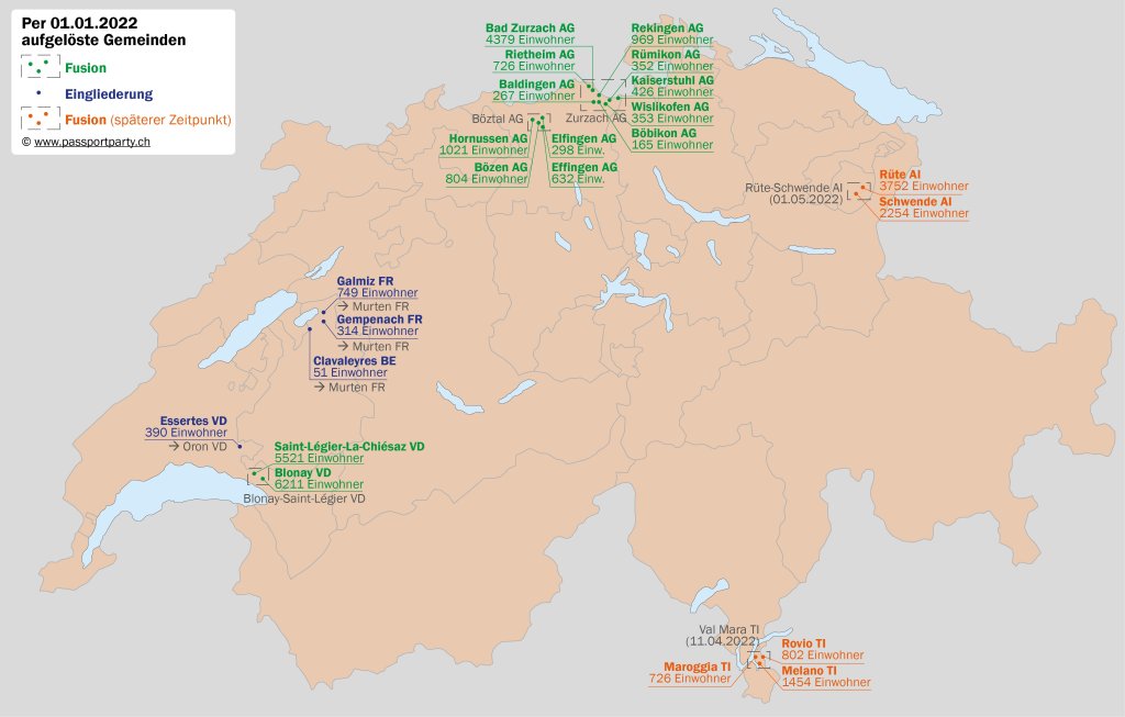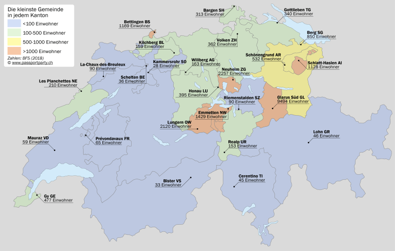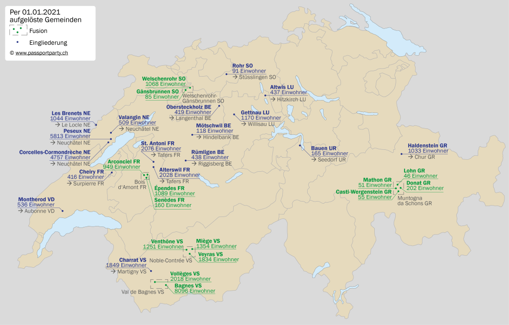 Der 31. Dezember 2021 war der letzte Tag in der Geschichte von 18 Gemeinden der Schweiz. Im Aargau fusionierten gleich acht Gemeinden zur neuen Gemeinde Zurzach AG – allerdings machten nicht alle Gemeinden im Zurzibiet mit: Mellikon und Fisibach bleiben selbständig. Mellikon wird so zur Enklave, Kaiserstuhl zur Exklave. Im Lauf des Jahres wird es zwei weitere Fusionen in den Kantonen Tessin und – eine kleine Sensation – Appenzell Innerrhoden geben.Es gab sogar eine interkantonale Fusion: Die kleine Berner Gemeinde Clavaleyres (51 Einwohner) schloss sich – zusammen mit den Freiburger Gemeinden Gempenach und Galmiz – der Gemeinde Murten an. Die Exklave hatte seit 1484 zu Bern gehört, nur nach den Wirren der Französischen Revolution war sie kurzzeitig Teil des Kantons Freiburg. Anders als ihr Name vermuten lässt, ist die Bevölkerung deutschsprachig. Eigentlich wollte Clavaleyres mit der Berner Schwesterexklave Münchenwiler BE fusionieren – dieses lehnte das Begehren 2006 aber ab. Also schaute sich Clavaleyres nach anderen Partnern um – und wurde in Murten fündig. Die interkantonale Fusion löste einen beachtlichen Papierkrieg aus, von Abstimmungen in den beteiligten Gemeinden über die Kantonsparlamente von Bern und Freiburg bis hin zu einem Antrag des Bundesrats an die Bundesversammlung. Übrigens grenzt Clavaleyres nicht an die bisherige Gemeinde Murten und bleibt so weiterhin eine Exklave – wenn auch neu nur noch auf Gemeindeebene.Dies wird voraussichtlich ab dem 1. Januar 2026 die neue Grenze zwischen den Kantonen Bern und Jura sein: Am 28. März 2021 sprachen sich 55% der Einwohner Moutiers dafür aus, sich dem Kanton Jura anzuschliessen. Die Grenze ist ziemlich kurios: Sie macht das kleine Dorf Roches BE praktisch zu einer bernischen Exklave, nur über einen Berg wird das Dorf mit dem Rest des Kantons verbunden sein. Ausserdem trennt sie Moutier von seinen Vororten Perrefitte, Eschert und Belprahon. Der Kanton Bern wird übrigens schon vor 2026 Territorium verlieren: Am 1. Januar 2022 fusioniert die kleine Exklave Clavaleyres mit dem freiburgischen Murten, das Gebiet geht an den Kanton Freiburg über.Erst 1951 kam es an der schweizerisch-französischen Grenze zur letzten Grenzveränderung. Im Nordosten des heutigen Kanton Juras ragt ein Stück Schweiz weit nach Frankreich hinein, der sogenannte Largzipfel (auch „Entenschnabel“ genannt). Er wird vom Bächlein Larg begrenzt. Der Larg aber veränderte mit der Zeit seinen Lauf, so dass der schweizerische Grenzstein Nr. 110 nach dem Zweiten Weltkrieg plötzlich am französischen Ufer lag. 1951 kamen die beiden Länder überein, dass der Flusslauf die Grenze bilden sollte und nicht der uralte Grenzstein, die Schweiz verlor so ein paar Quadratmeter Territorium. Kein grosser Verlust: Mittlerweile hat die Schweiz just an der Stelle eine Brücke gebaut, deren Brückenkopf auf der französischen Seite fast das ganze verlorene Gebiet belegt. Bilder und Details dazu im Bericht zu meiner Winterwanderung.Wer kennt es nicht: Auswärtige erkennt man daran, dass sie nicht wissen, wie man lokale Ortsnamen richtig ausspricht. Die „korrekte“ Aussprache von Ortsnamen ist in der Deutschschweiz häufig Insiderwissen. Manche Aussprachen sind lediglich durch den Dialekt bedingt, häufig aber ist der Unterschied doch deutlich grösser. Die Landkarte gibt einen Überblick über einige der krassesten Beispiele. Ein anderes Thema sind übrigens die Abkürzungen von Ortsnamen, die besonders im Raum Zürich beliebt sind – Bassi für Bassersdorf, Dübi für Dübendorf, Hombi für Hombrechtikon (!!!) – oder auch La Tchaux für La Chaux-de-Fonds im Kanton Neuenburg.Einst war die Schweiz sehr kleinräumig: Selbst kleinste Dörfer hatten eigene politische Organe und eine Verwaltung. In den letzten 30 Jahren sind viele solche Kleinstgemeinden durch Fusionen verschwunden – am radikalsten im Kanton Glarus, wo es nur noch drei Gemeindem gibt. Die Karte zeigt für jeden Kanton die kleinste Gemeinde. Schweizweit am wenigsten Einwohner hat die Gemeinde Kammersrohr SO, die seit vielen Jahren erfolgslos einen Fusionspartner sucht.Die letzten Veränderungen der Schweizer Grenze liegen gar nicht so lange zurück. 1862 trat die Schweiz im Vertrag von Dappes ein Tal südwestlich des Weilers La Cure ab, da dieses Tal für Frankreich militärische Bedeutung hatte. Im Gegenzug erhielt die Schweiz Gebiet am Noirmont sowie einen Teil von La Cure, das seither von der Grenze geteilt wird.Die Grenze teilt nicht nur La Cure, sondern auch mehrere Gebäude in diesem Dorf. Einige davon entstanden überhaupt erst wegen der Grenze – zum Beispiel das Hotel Arbez, das sogar Hotelzimmer hat, durch welche die Grenze verläuft. Mehr zu diesem einzigartigen Hotel findet sich in diesem Blogeintrag.Am 1. Januar 2021 wurden 31 schweizerische Gemeinden mit teils jahrhundertealter Geschichte aufgelöst. Viele von ihnen schlossen sich einer grösseren Nachbargemeinde an (in der Landkarte blau markiert). Andere fusionierten zu einer neuen Gemeinde mit neuem Namen. Diese Namen finde ich nicht immer sehr gelungen, da sie besonders im Kanton Freiburg häufig etwas gesucht klingen und wenig mit traditionellen Ortsbezeichnungen gemein haben.