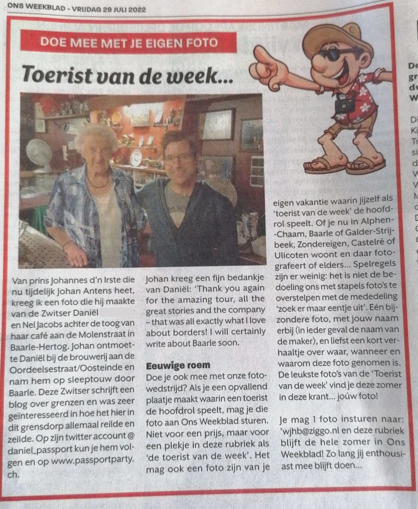 Zu später Stunde verlieh mir Johan in seiner Funktion als Karnevalsprinz sogar eine Medaille. Nun bin ich kein grosser Fasnachts-Fan, aber die Medaille der «Grenzsukkers» aus Baarle (und zwar beiden Baarle!) nahm ich gern entgegen als Abschluss und Krönung dieses grenzintensivsten Tages meines Lebens. Es war mir eine besondere Ehre, dass in der folgenden Woche sogar die Lokalpresse über meinen Besuch in Baarle-Hertog und Baarle-Nassau berichtete: