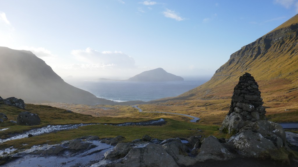 Färöer ist dermassen windig, dass die Wasserfälle manchmal aufwärts fliessen und der Weltfussballverband FIFA eine Sonderregel erlassen hat, dass bei starken Böen ein Mitspieler beim Penalty neben den Ball knien und ihn festhalten kann, bis der Schütze geschossen hat. Tage ohne Regen sind ausserordentlich selten, und die Temperaturen sogar im Sommer nicht besonders warm. Wie ist es also im November? Wie sich herausstellte: Ziemlich gleich wie im Sommer, einfach im Durchschnitt wohl etwa fünf Grad kühler. Jedenfalls waren nicht die Temperaturen unangenehm, sondern gelegentlich die Mischung zwischen Regen und Böen. Das Tageslicht dauerte von neun Uhr bis kurz vor fünf – auch das gut aushaltbar. Im Winter wird es dann dunkler. Dafür sind dann die Temperaturen meist höher als in der Schweiz, Schnee ist eher selten – Golfstrom sei Dank.