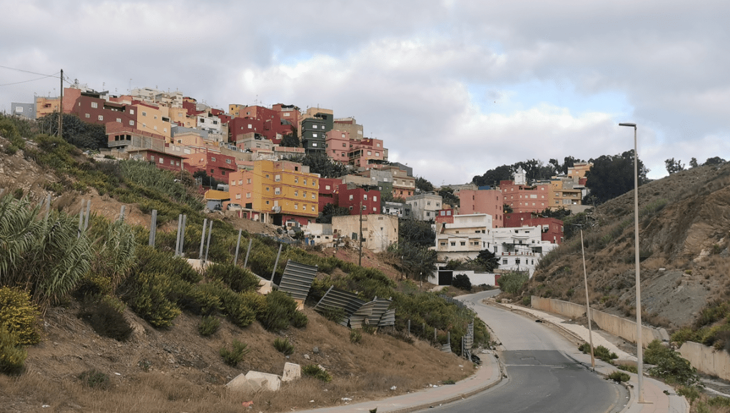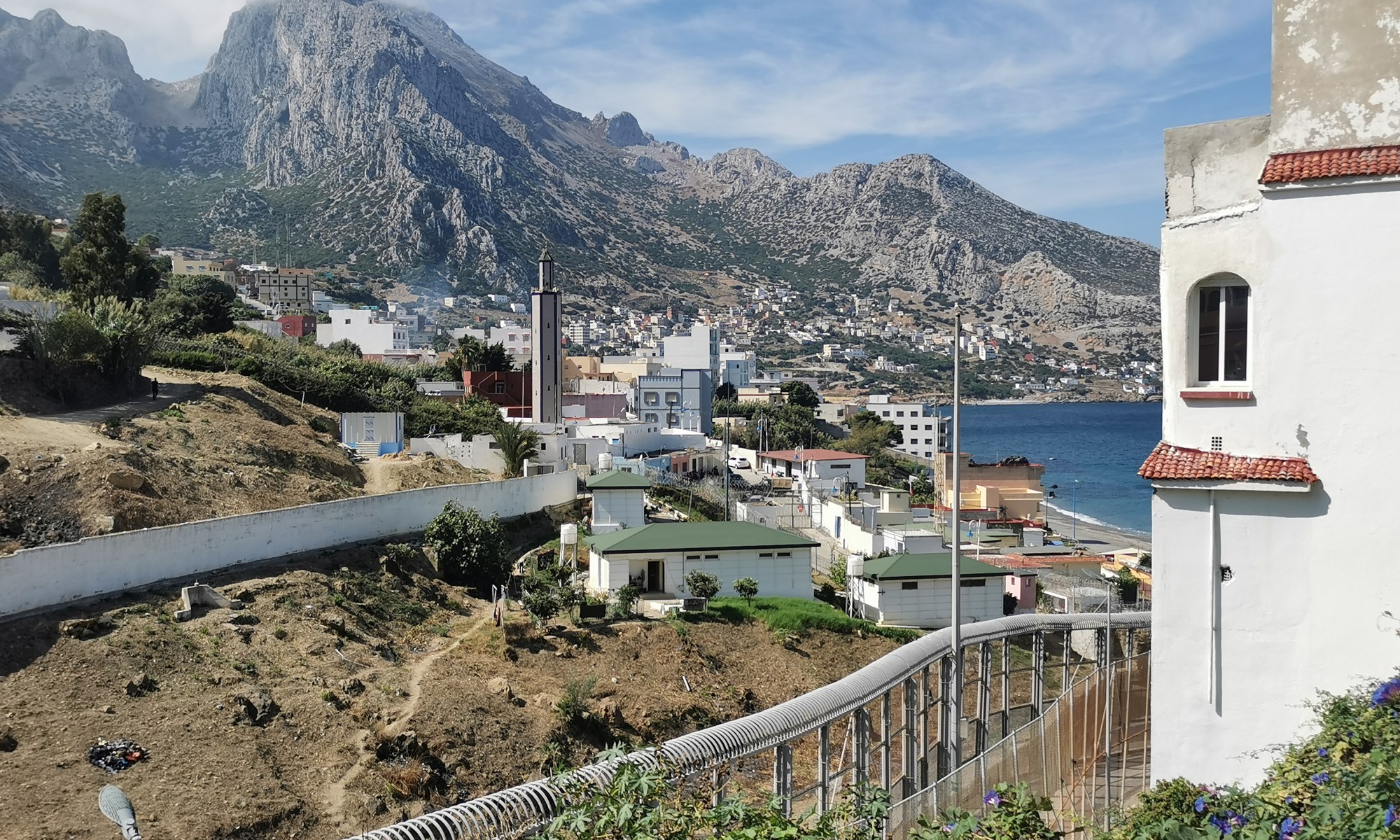 Fronteriza ist ein arabisch geprägter Weiler mit passendem Namen: Es liegt direkt an der Grenze, bzw. verläuft diese mitten durch den Ort. Früher gab es hier einen Grenzübergang, mittlerweile ist alles abgeriegelt. Der vordere Grenzzaun gehört Spanien. Dahinter die Bauten der marokkanischen Sicherheitskräfte und die marokkanische Mauer. Einst war dies eine geschlossene Mauer – heute benötigt der Bewohner des weissen Hauses ganz rechts weit mehr als eine Stunde, um zur Moschee zu gelangen, die er von seinem Fenster aus sieht und die ihn sicher jeden Morgen weckt.