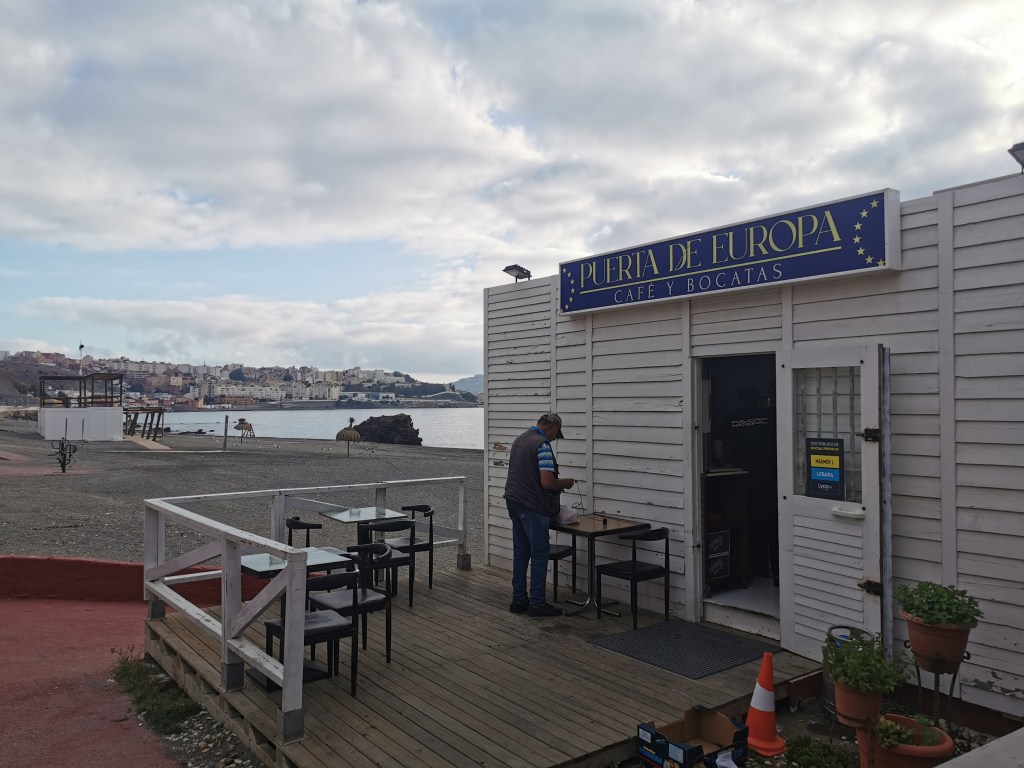 Wenn man den Bus verlässt, hat man den Eindruck, schon in Marokko zu sein: Das Dorf El Príncipe unterscheidet sich optisch null von den umliegenden marokkanischen Dörfern. Es gibt drei Moscheen (ein Minarett ist rechts im Bild zu sehen), die Bevölkerung ist mehrheitlich muslimisch und arabischsprachig. Dies trifft übrigens auf etwa die Hälfte der Bevölkerung der ganzen Exklave Ceuta zu. Spanisch ist aber, dass man sich von dort aus entlang des Strands an einer Reihe von Chiringuitos (Strandbars) entlang zum Grenzübergang bewegt. Die letzte Bar heisst „La Puerta de Europa“ (das Tor Europas) und dürfte die letzte Möglichkeit für einige hundert Kilometer sein, ohne Weiteres Bier zu kaufen.