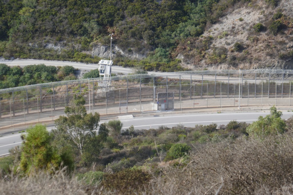 Erstaunlicherweise gibt es einen Aussichtspunkt mit Blick auf diese Grenzbefestigungen, den „Mirador de la Frontera“. Es ist nicht ganz einfach, da hinzukommen: Ein stündlich verkehrender Bus fährt nur bis zum unterhalb des Hügels gelegenen Gefängnis, die Taxifahrer kennen den Ort nicht. Kein Wunder: Er ist nur auf den Landkarten verzeichnet, kein Wegweiser führt dahin. Also lotste ich den Taxifahrer, bis er den Weg gefunden hatte. Die Aussicht ist wirklich eindrücklich: