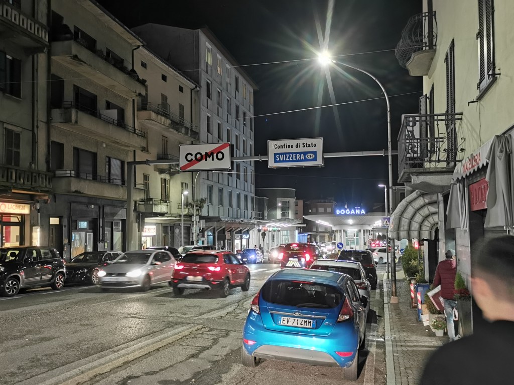 Deutlich mehr los ist am Grenzübergang Chiasso-Strada, im Ortskern von Chiasso. Eigentlich ist auch Chiasso eine geteilte Stadt, denn das Quartier Ponte Chiasso, das zur Stadt Como gehört, ist geografisch gesehen ein Ortsteil von Chiasso. Es schliesst sich direkt an den Grenzübergang an. Auch wenn Sprache und Architektur auf beiden Seiten der willkürlichen Linie fast gleich sind, merkt man doch sofort, dass man in einem anderen Land ist. Während im kühl-schweizerischen Chiasso an diesem frostigen Herbstabend die Fussgängerzone einen verlassenen, deprimierenden Eindruck macht und sich das gesellschaftliche Leben auf das Murrayfield Pub beschränkt, steppt in Ponte Chiasso der Bär.