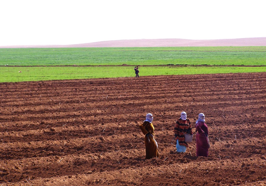 Welch wohltuender Kontrast zu dieser martialischen Landschaft bot das liebliche Syrien! Hier reichten die grünen Felder der Kleinbauern direkt bis an die Gleise, überall sah man Frauen und Männer bei der Feldarbeit, oft begleitet von spielenden Kindern. Wo immer der Zug passierte, winkten die Bauern frenetisch, und wir Zugspassagiere zurück. Wie die Bewohner der Dörfer und Städte auf der türkischen Seite und auch die Zugpassagiere sind die syrischen Bauern hier fast ausschliesslich Kurden – ein Volk, das durch diese künstliche Grenzziehung aufgeteilt wurde. Die Dschazira-Ebene gehört zu den fruchtbarsten Ecken Syriens, die Einöde auf der türkischen Seite ist rein militärisch bedingt.