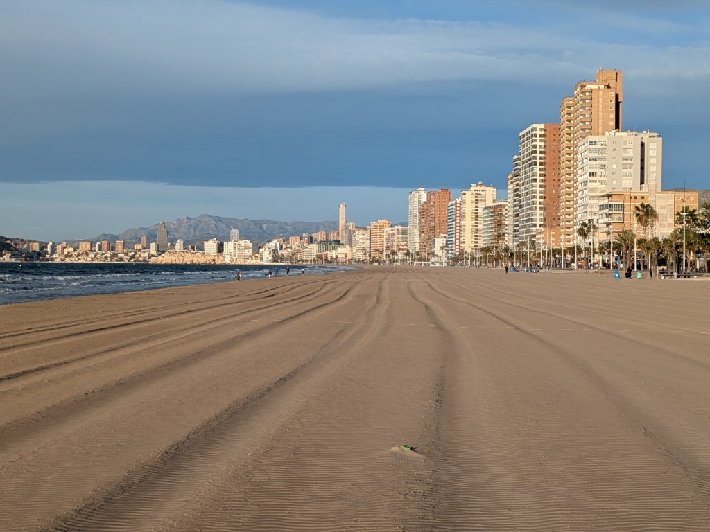 Die Geografie Benidorms ist simpel: Es gibt zwei jeweils zwei Kilometer lange, perfekte Strände. Sie haben den obersten Gütesiegel der EU (sowas gibt’s, natürlich, die „blaue Flagge“) und werden wie Skipisten jeden Morgen frisch präpariert. Die Strände heissen Platja de Ponent (westlicher Strand) und Platja Llevant (östlicher Strand), dazwischen liegt der alte Ortskern. Das östliche Ende ist fest in britischer Hand, am westlichen Rand urlauben die Spanier (also die kastilischsprachigen Touristen und ein paar Basken und Gallegos, nicht die valencianischsprachigen Benidormer). Je näher dem Zentrum, desto mehr vermischen sich die beiden Gruppen, wobei die Altstadt nicht nur den Einheimischen gehört, sondern auch der Gay-Szene, wie zahlreiche mit Regenbogen beflaggte Bars unschwer erkennen lassen.