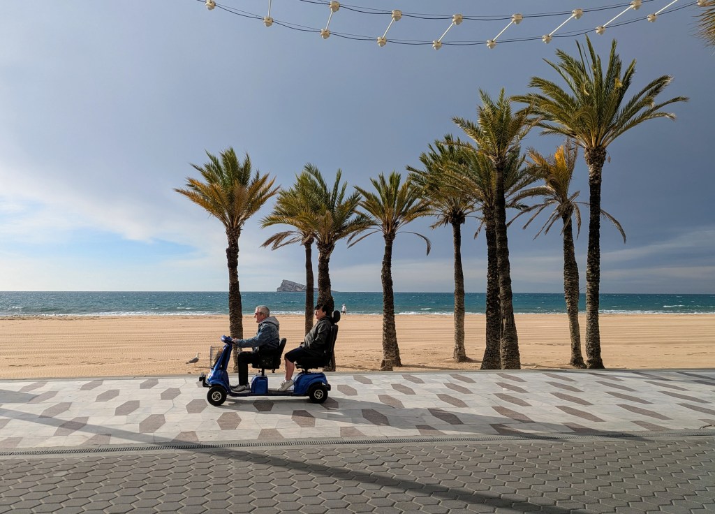 Wenig überraschend ist das Transportmittel der Wahl im britischen Teil Benidorms der „Scooter“, der den Rentern in der weitläufigen Küstenstadt allzuviel Bewegung erspart. Sogar Tandem-Scooters für Paare gibt es. Nur aus Faulheit darf man sie sich aber nicht mieten, die Werbetafel eines Vermieters verfügte streng: „Mobility scooters only for people over 55 years old.“