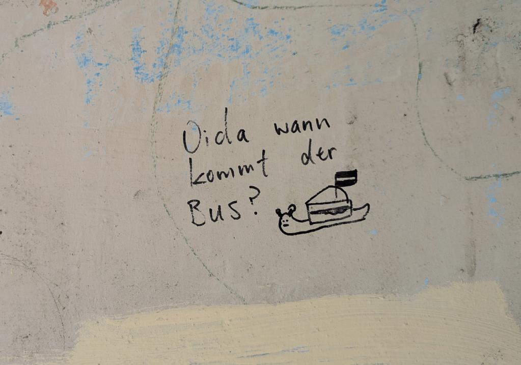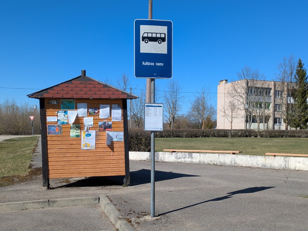 Beschwingt und zufrieden mit meinem Einfall, diese abgelegene Grenze zu Fuss zu überqueren, ging ich durch das Dorf. Der Gedanke schoss mir durch den Kopf, dass wohl kaum sonst jemand auf die Idee gekommen wäre, auf diesem tollen Weg nach Lettland einzureisen (wer interessiert sich schon für Grenzen?). Nur zehn Meter weiter wurde ich schon jäh in die Realität zurückgeholt. Ich machte kurz Pause an der Bushaltestelle von Zemgale und fand dort Klebbilder der polnischen Fussballfans von Jagiellonia Białystok sowie eine Filzstift-Aufschrift eines ungeduldigen Österreichers: „Oida wann kommt der Bus?“ Eigentlich auch nicht ganz überraschend. Auch praktisch veranlagte Menschen kommen auf den Gedanken, auf Google Maps Bushaltestellen in Grenznähe zu suchen, wenn der Zug halt nicht weiterfährt. Und von Zemgale aus, nicht einmal eine Halbstunde Fussmarsch von Turmantas entfernt, fahren immerhin vier Busse pro Tag nach Daugavpils. Mit dem ersten Zug aus Vilnius am frühen Morgen (Ankunft Turmantas: 07:51) hat man immerhin beinahe Anschluss mit dem Bus, der um 08:45 von Zemgale nach Daugavpils fährt.