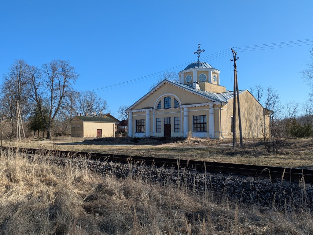 Der Pfad weiter hinein nach Lettland verläuft entlang der Bahngleise. Matkunci heisst die lettische Grenzstation, die nur aus einem verlassenen Holzhaus besteht, vor dem zerschlissene Sofas herumliegen. Weiter kommt man an einem Bunker vorbei – natürlich, strategische Lage. Nach zwei Kilometern dann der erste lettische Bahnhof, Zemgale. Beziehungsweise das, was nach einer Umnutzung daraus geworden ist: eine orthodoxe Kirche! Das fand ich schon ziemlich überraschend, fallen in Mitteleuropa doch nicht selten Kirchen selbst Umnutzungen zum Opfer…