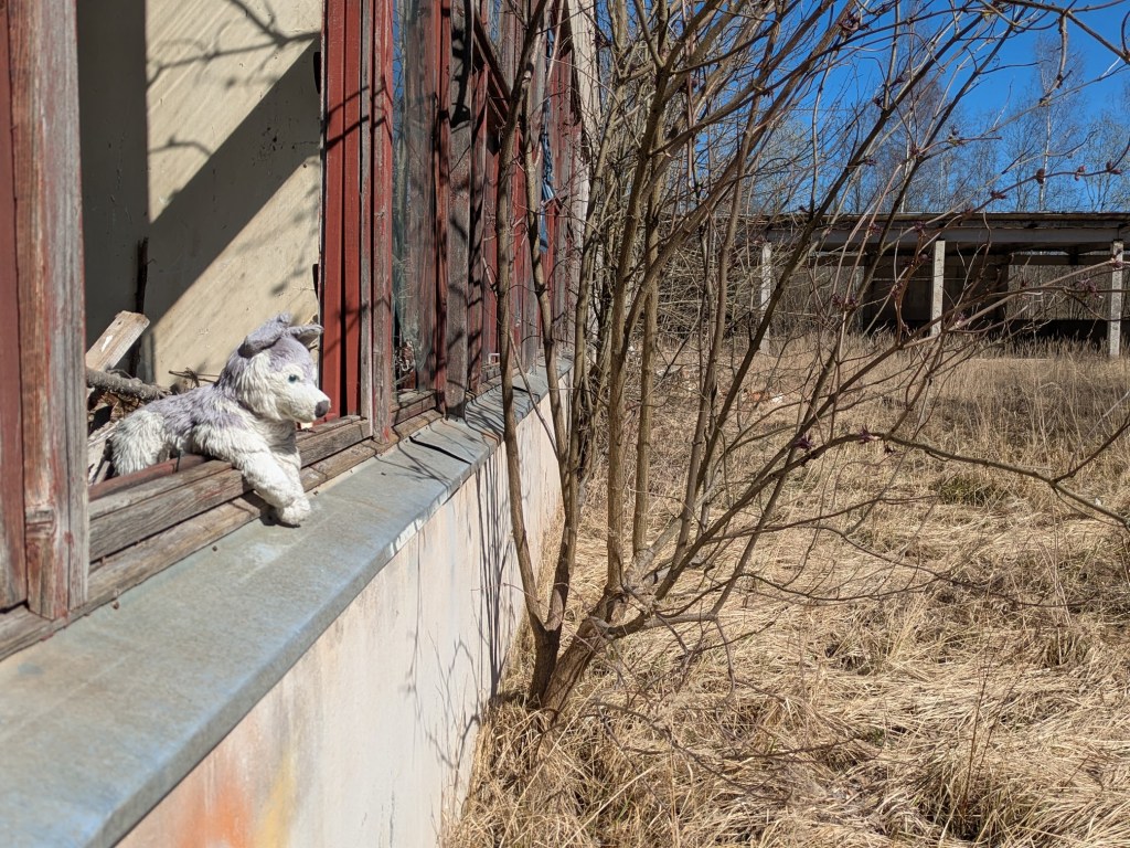 Ein etwas eigenartiger Brauch ist es, an Lost Places Plüschtiere zu deponieren. Einst hatte mich ein Pferdchen im schweizerischen Sanatorio del Gottardo erschreckt. Auch in Demene konnte man darauf nicht verzichten und drapierte unter anderem einen symbolischen Wachhund an einem der Fenster. Und einen knallrot-giftgrünen Pilz.