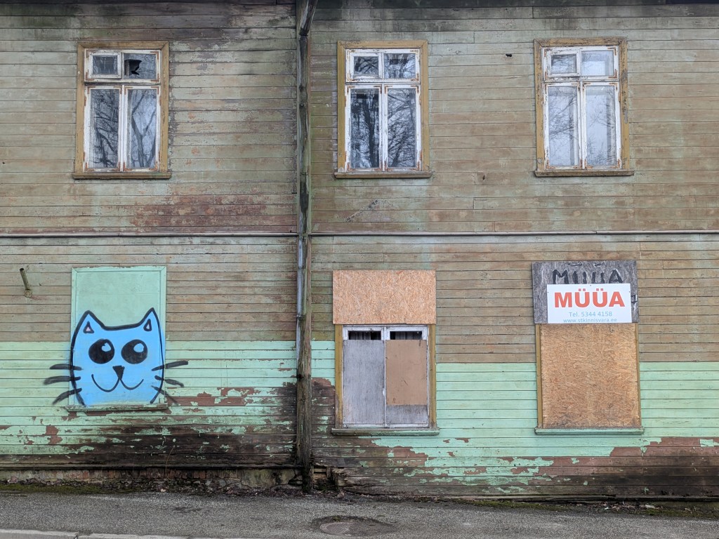 Zum Glück gibt es die Grenze. Schon lange habe ich keine so trostlose Ortschaft mehr gesehen. Ein grosser Teil der Häuser steht leer – kein Wunder: Seit dem Zusammenbruch der Sowjetunion ist die Einwohnerzahl um etwa einen Dritte zurückgegangen. Immerhin hat jemand auf die meisten Geisterhäuser farbige Katzenköpfe gesprayt. Menschenleere Strassen, Temperaturen um den Gefrierpunkt und eine steife Brise komplettieren den desolaten Eindruck.