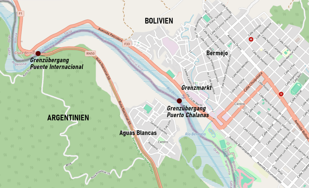 Der Lonely Planet preist Bermejo als angenehmen Grenzübergang zwischen Bolivien und Argentinien an (wohl im Gegensatz zum garstigen Villazón). Man müsse nur aufpassen, einen der Tage zu erwischen, an denen ein Bus direkt von Tarija (Bolivien) nach Salta (Argentinien) fahre. Sonst werde es kompliziert: man müsse erst in die Grenzstadt Bermejo reisen, herausfinden wo man den Ausreisestempel bekommt, den Grenzfluss mit einem kleinen Boot überqueren, mit einem klapprigen Bus in die nächste Stadt und von dort aus weiter in grössere argentinische Orte. Ich konnte nicht anders, als dies als Einladung zu verstehen.