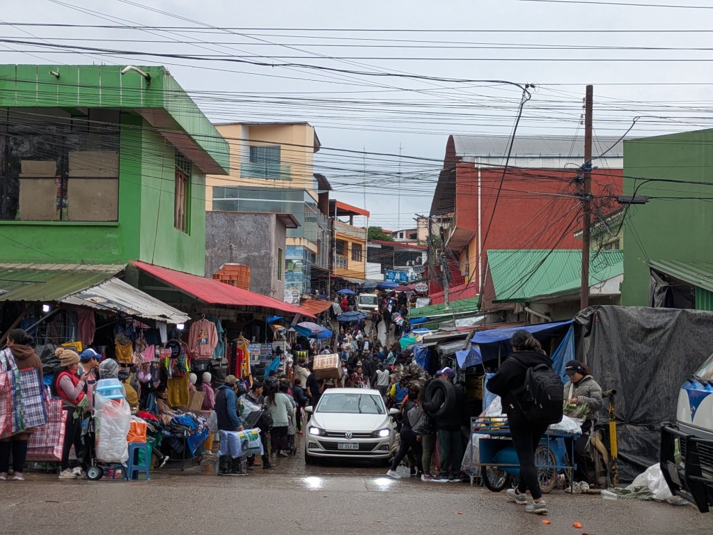Die Grenzstadt Bermejo empfing mich mit Regen, Abgas, Lärm und Menschengewimmel. Eine Grenzstadt eben, da darf ich nicht jammern. Sie umfasst einen ausgedehnten Markt mit Ramsch aus China und der Türkei (jawohl, es gab Trainerjacken der Kadirli Ortaokolu Osmaniye) und dem attraktivsten Produkt, das Bolivien für Argentinier feilhält: Coca-Blätter. Ausserdem gibt es Wechselstuben mit ziemlich schlechten Kursen, Stände mit verlockend riechendem Streetfood und interessanterweise Gepäckaufbewahrungsstellen.