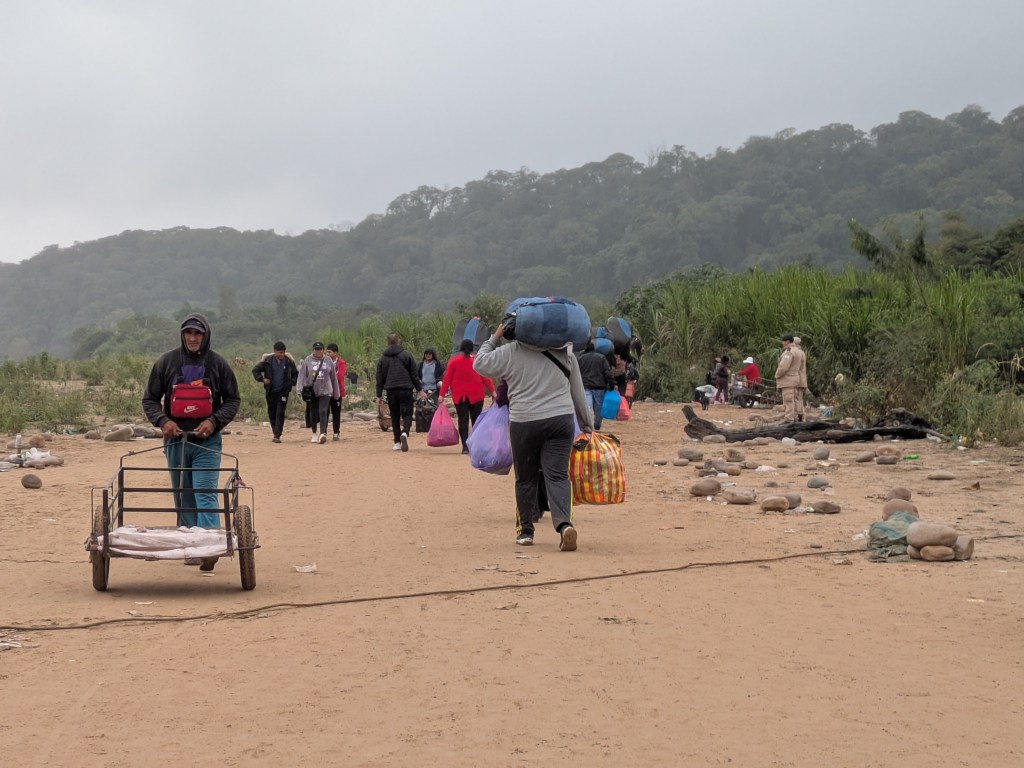 Es blieb mir also nichts anderes übrig, als zur 2. Etappe unkontrolliert die Grenze zu überqueren und zu hoffen, dass dies stimmte. Immerhin wäre es nicht allzu schwierig, zurück nach Bolivien zu gelangen. Die Überfahrt war trotz Regenwetter schön, mit Aussicht auf das Chaos von Bermejo und die stillen Wälder Argentiniens, aber leider viel zu kurz. Am argentinischen Strand angekommen, war ich kurz in Versuchung, noch 2-3 Mal hin- und herzufahren, besann mich dann aber doch eines Besseren und suchte die Stelle, wo die Pässe kontrolliert werden.