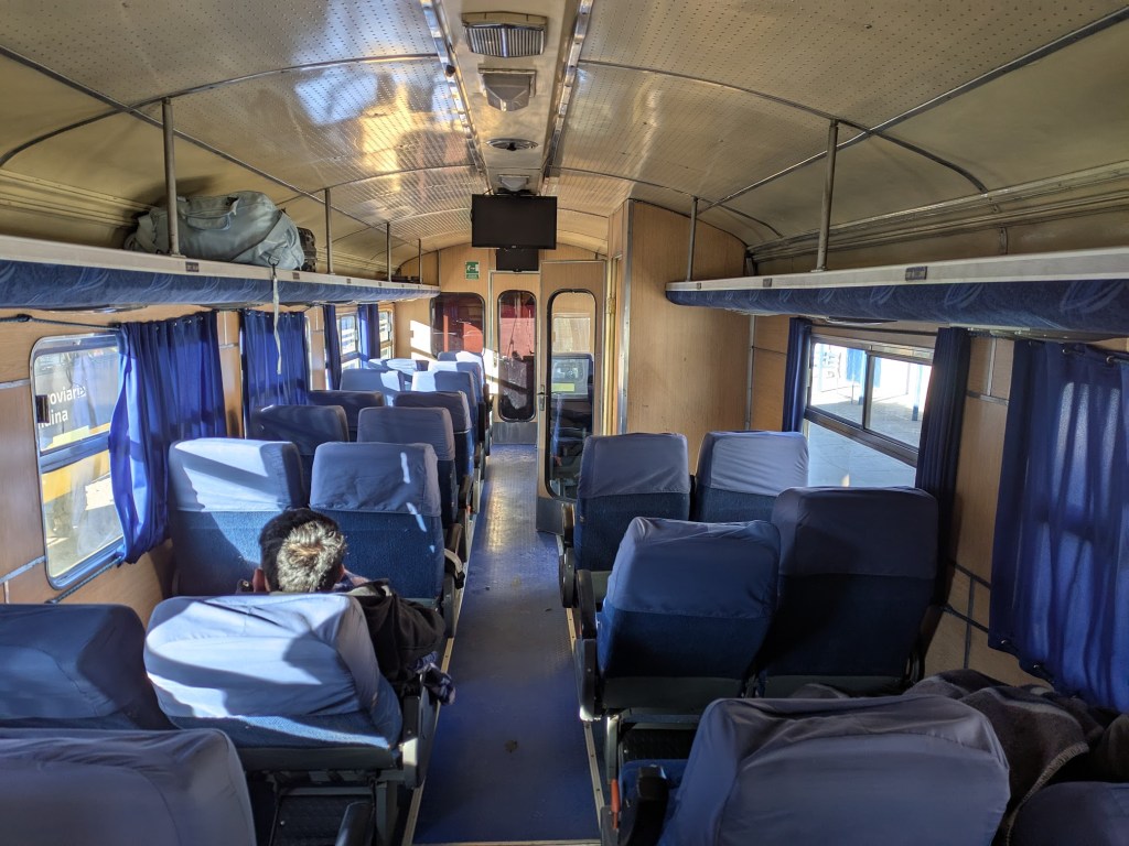 Nach einer Nacht im ungeheizten Hotelzimmer wartete ich bei -6° bibbernd und ziemlich skeptisch am Bahnhof von Atocha. Skeptisch, weil verschiedene Einheimische erwähnt hatten, der Zug fahre gar nicht. Was auch tatsächlich der Fall war – bis heute! Denn am Bahnhof von Villazón hatte man mir bestätigt, dass der Betrieb am 23. Juni 2025 wieder aufgenommen würde. Doch im morgendlichen Atocha sah es gar nicht danach aus: ausser der Toilettendame war kein Mensch am Bahnhof. Und die Gleise machten kaum einen befahrbaren Eindruck. Erleichtert und auch ziemlich begeistert sah ich kurz nach acht Uhr den Ferrobus anrumpeln. In Oruro war er am Vorabend abgefahren und hatte nur wenige Minuten Verspätung.