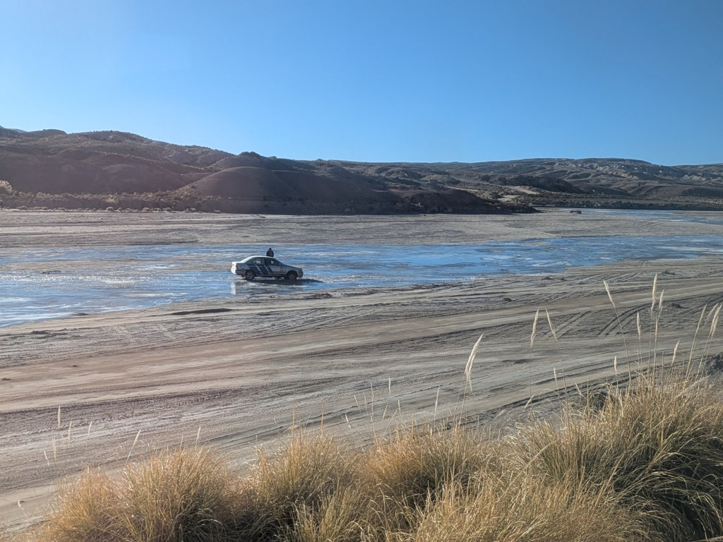 Der erste Streckenabschnitt nach Atocha führt auf über 4000 Metern über eine Hochebene mit zugefrorenen Flüssen. Hier leben keine Menschen, nur Lamas. Und sie sieht man nur von hinten, denn sie rennen alle vom Zug davon (daran könnten sich in tieferen Lagen die Ziegen, Schafe und Hunde ein Beispiel nehmen). Doch einige Kilometer hinter Atocha säumt plötzlich eine etwa einen Kilometer lange Schlange von Jeeps die Bahnlinie. Bald wird klar, wo sie anstehen: Hier gibt es eine Tankstelle (warum auch immer?!?). Benzin ist derzeit rar in Bolivien und wie es aussieht, warten Autofahrer stundenlang auf Tankmöglichkeiten.