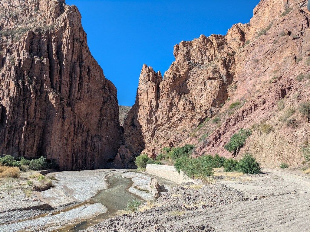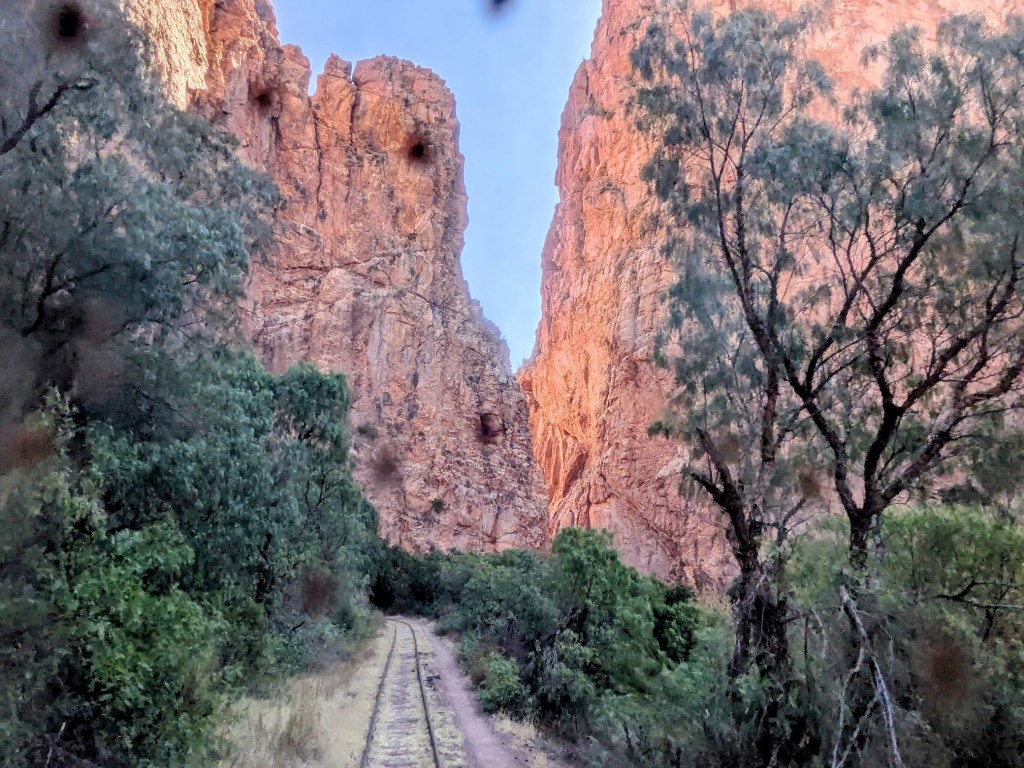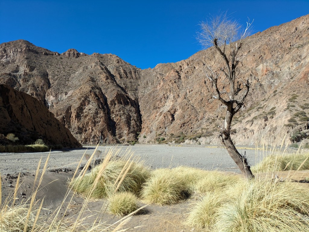 Die Fahrt von Atocha nach Tupiza betrug rund drei Stunden, und ebenso lange dauerte die nachmittägliche Fahrt von Tupiza in die Grenzstadt Villazón. Ganz gleich spektakulär wie der erste Teil war sie nicht, aber doch auch nicht schlecht. Nach einer Fahrt durch Vororte von Tupiza und ein landwirtschaftlich geprägtes Gebiet (Tupiza liegt ja nur auf 2900 Metern) trafen wir auf eine Klus namens El Angosto, in welcher der Zug gern einen Fotohalt hätte einlegen können. Bei einem Tempo von 25 bis 30 km/h war es allerdings ohnehin nicht allzu schwer, gelegentlich gute Fotos zu schiessen.