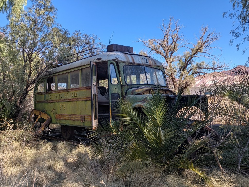 In Tupiza, der grössten Ortschaft entlang meiner Strecke, trafen wir genau pünktlich ein. Der Fahrplan sieht hier einen Aufenthalt von 100 Minuten vor, schön auf die Mittagszeit gelegt. Ich nutzte die Zeit, um in mein Hotel einzuchecken (da ich die Nacht in Tupiza verbringen würde), mir Proviant für die nächsten Tage einzukaufen (ich plane eine Reise in noch einsamere Regionen im Südwesten), das Stadtpanorama von einem Aussichtspunkt aus zu geniessen und mich mit Empanadas einzudecken, um sie gemütlich am Bahnhof zu verspeisen. Am Schluss blieb sogar noch Zeit für einen Spaziergang über den Eisenbahnfriedhof, der sich an den Bahnhof anschliesst.