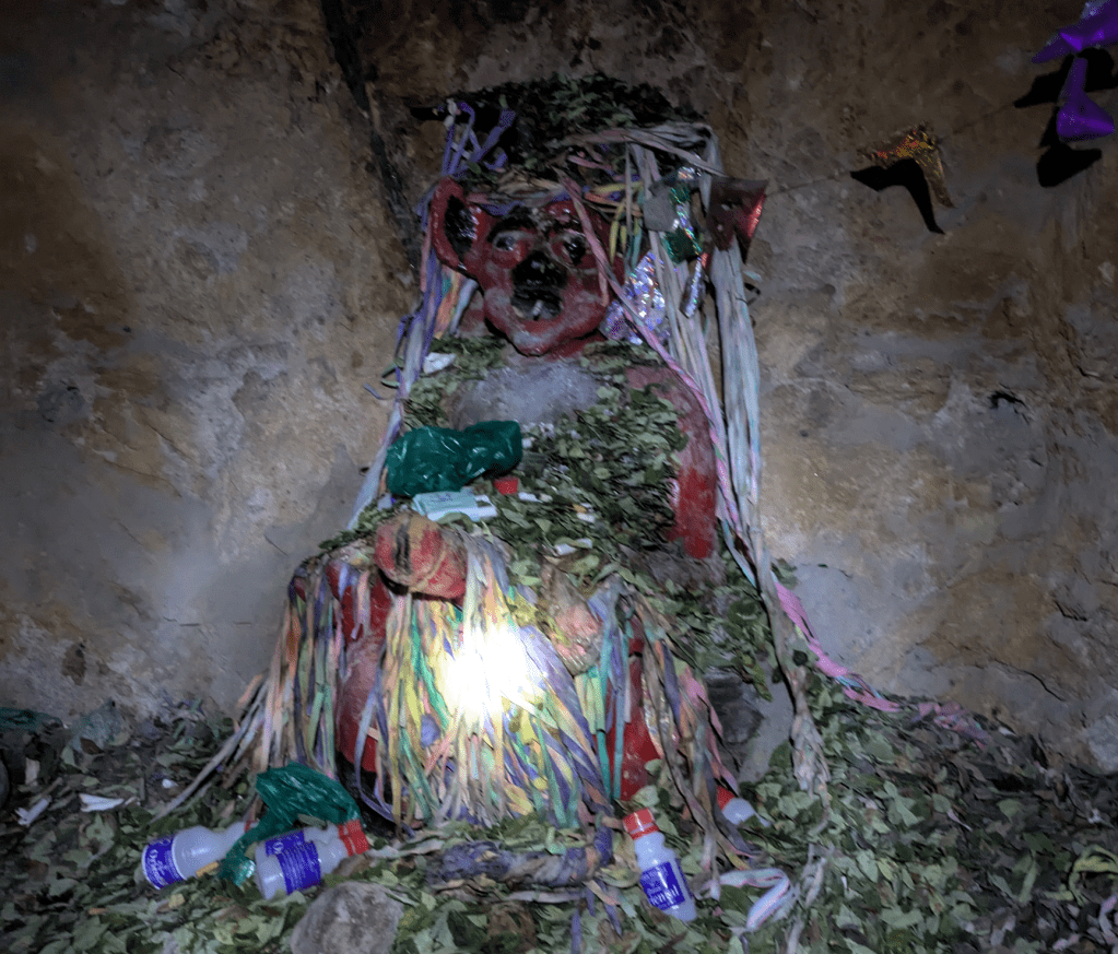 Rituale spielen bei den Bergleuten eine grosse Rolle. Sie orientieren sich stärker an der alten Inka-Religion als am Christentum. Auf dem Bild oben sieht man, dass das Eingangsportal schwarz gefärbt ist. Dies liegt daran, dass die Bergleute Lamas opfern und ihr Blut an den Mineneingang spritzen. Dieses Jahr hat die Kooperative Kunti bereits 46 Lamas geopfert. Am Tageslicht ist die Inka-Göttin Pachamama für die Bergleute zuständig, im Berginnern hingegen der Gott Tío. In der Nähe aller Mineneingänge gibt es Statuen von ihm, die an indische Gottheiten erinnern. Bergleute bringen Tío Coca-Blätter, Zigaretten und Alkohol. Auch unsere Gruppe trank zwei Runden Shots (jawohl, der 96%-ige Alkohol) auf sein Wohl.