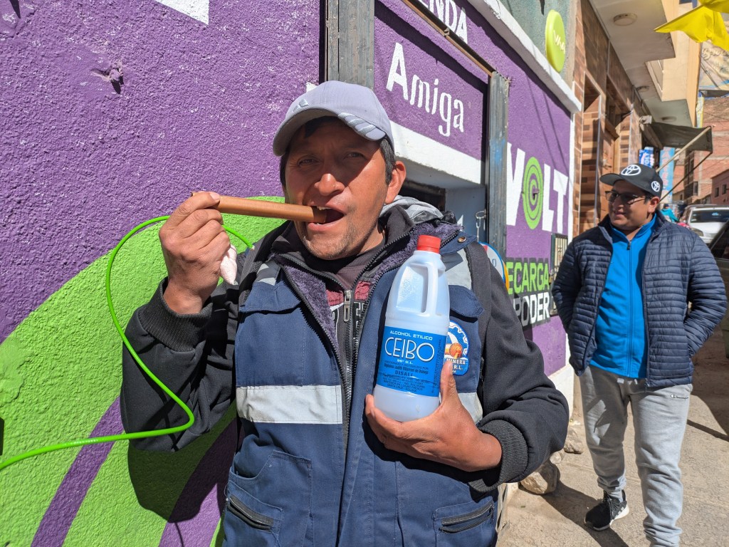Zuletzt noch die Frage der Sicherheit und Ethik. Wie berichtet, sind die Sicherheitsvorkehrungen in den Minen rudimentär. Man muss körperlich einigermassen fit sein, um auf dieser Höhe geschwind durch die engen Stollen tappen zu können. Und jederzeit auf Löcher und die vorbeischiessenden Waggons aufpassen. Aber täglich finden zahlreiche solche Touren statt, Zwischenfälle sind keine bekannt. Wer fit genug und kein Klaustrophobiker ist, kann sich durchaus wagen. Ob es in Ordnung ist, einen solch elenden Arbeitsplatz in einem armen Land zu besuchen, ist eine andere Frage, die jede/r für sich selbst beantworten muss. Dazu nur so viel: Die Bergleute sind stolz auf ihre Arbeit, sprechen gern darüber und posieren für Fotos. Als wir dem Gott Tío unsere Opfer brachten, bat ihn Führer Wilson um mehr Touristen – besonders Japaner, die am meisten Trinkgeld geben. Aus Sicht der Betroffenen scheinen diese Touren also OK zu sein – besonders, wenn man sie bei den Bergleuten selber bucht.