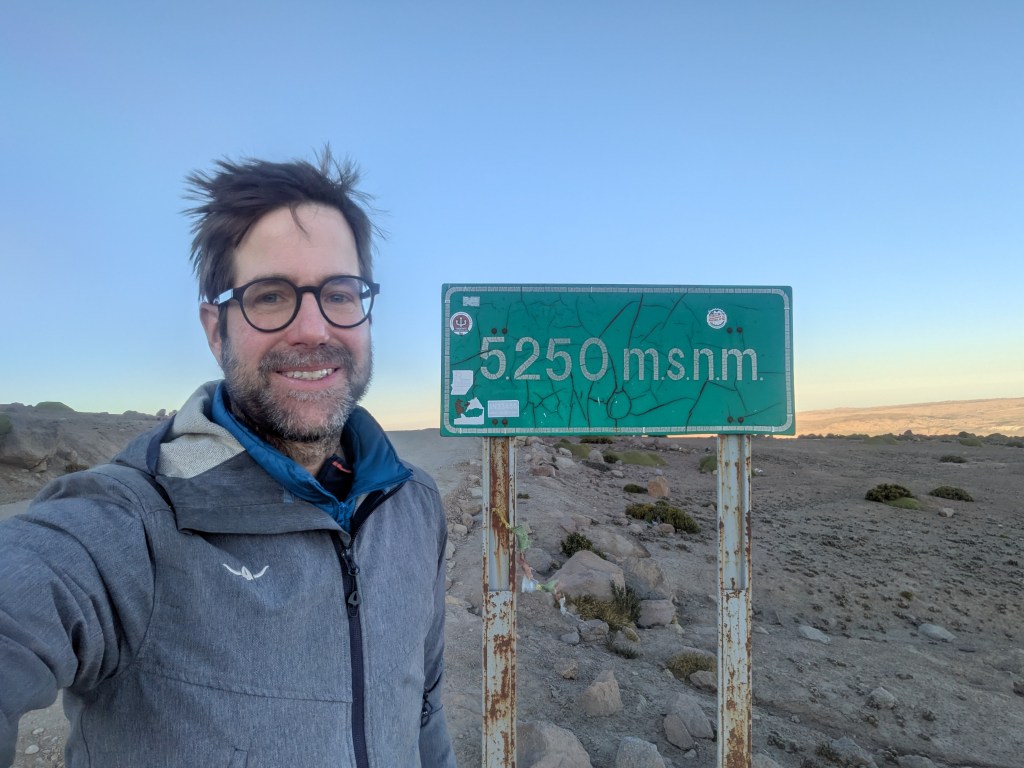 Es ist ein Highlight im eigentlichen Sinn: Nie zuvor bin ich so hoch über dem Meeresspiegel gewesen wir hier. Nicht im Dreiländereck selbst, sondern auf der Anreise. Von Putre in Chile aus reise ich mit eigenem Fahrer an, öffentlichen Verkehr gibt es hier nicht.* Das ist für lokale Verhältnisse ziemlich teuer, rund 100 Fr. für die dreistündige Fahrt. Darum will mir der Fahrer – er arbeitet sonst als Chauffeur der Dorfschule der Grenzorte – etwas bieten und baut alle möglichen Attraktionen ein. Darunter auch der höchste Punkt meines Lebens, ein Schild nahe des Vulkans Taapacá, das eine Meereshöhe von 5250 Metern verkündet. Ein Selfie wert, aber leider nicht ganz wahr. Mein Handy-GPS zeigte bescheidene 4900 Meter an, nachträgliche Online-Recherchen ebenfalls. Schade.
