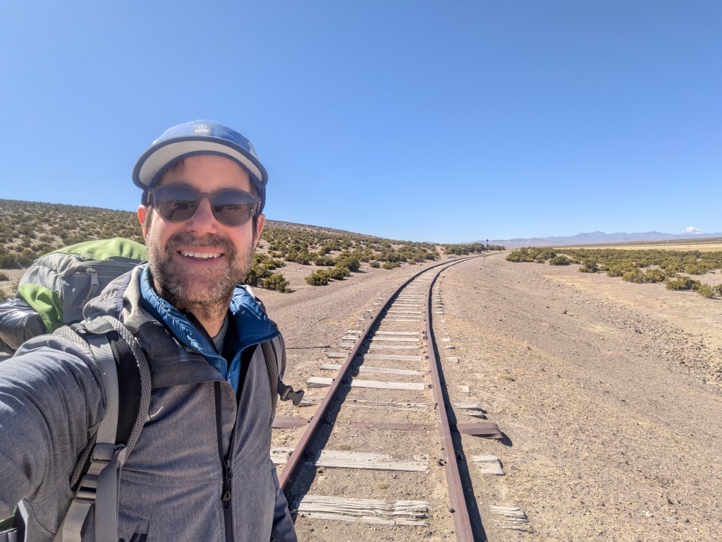 Von Visviri aus führen eine Strasse und eine Bahnlinie nach Charaña, dem vier Kilometer entfernten bolivianischen Grenzdorf. Autostopp ist aussichtslos, selbst das bolivianische Grenzpersonal war am Morgen zu Fuss gekommen. Dafür habe ich die Wahl: ganz offiziell ist es auch erlaubt, die Grenze auf der Bahnlinie zu queren. Denn sie ist stillgelegt. Die Chance nütze ich, also bin ich nach einem Auto auch noch ein Zug. Es ist eine herrliche kleine Wanderung über die Hochebene, umrahmt von Vulkanen mit schneebedeckten Gipfeln. Links sehe ich auf einem kargen Hügel Vicuñas aufgeregt schreiend herumrennen, rechts im Gras massenhaft braune und weisse Alpacas. Im Gegensatz zu den Vicuñas sind sie nicht wild und müssen sich offensichtlich auch an Grenzen halten: Ein langer Zaun hält sie davon ab, nach Bolivien zu gelangen und sich mit den dortigen Alpacas zu durchmischen. Mich als Zug hindert nichts am Grenzübertritt, leider nicht mal ein Schild, das das neue Land ankündigt.