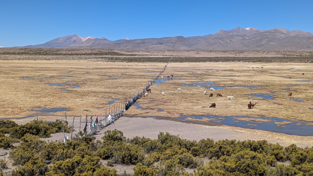 Ich habe schon viele abgelegene Grenzübergänge gesehen (beispielsweise von Kasachstan nach Kirgistan), aber so ganz allein wie in Visviri war ich noch nie. Visviri ist das chilenische Grenzdorf im Dreiländereck: Eine verlassene Bahnstation, 250 Einwohner und deutlich mehr Alpakas, 4083 Meter über Meer. Der Ortsname bedeutet: vom Winde umweht. Hinter dem verfallenen Bahnhofsgelände – einst grosser Grenzbahnhof – befinden sich die Grenzkontrollposten Chiles und Boliviens.