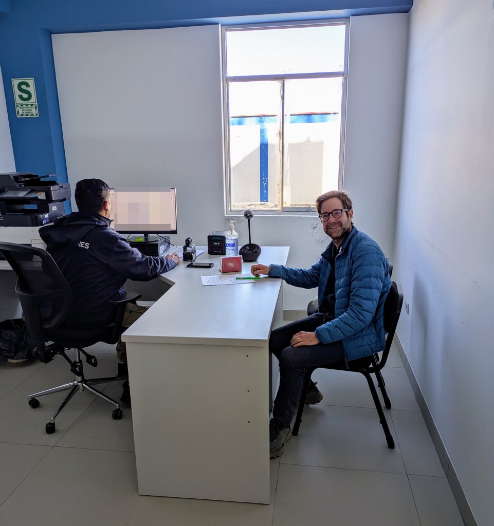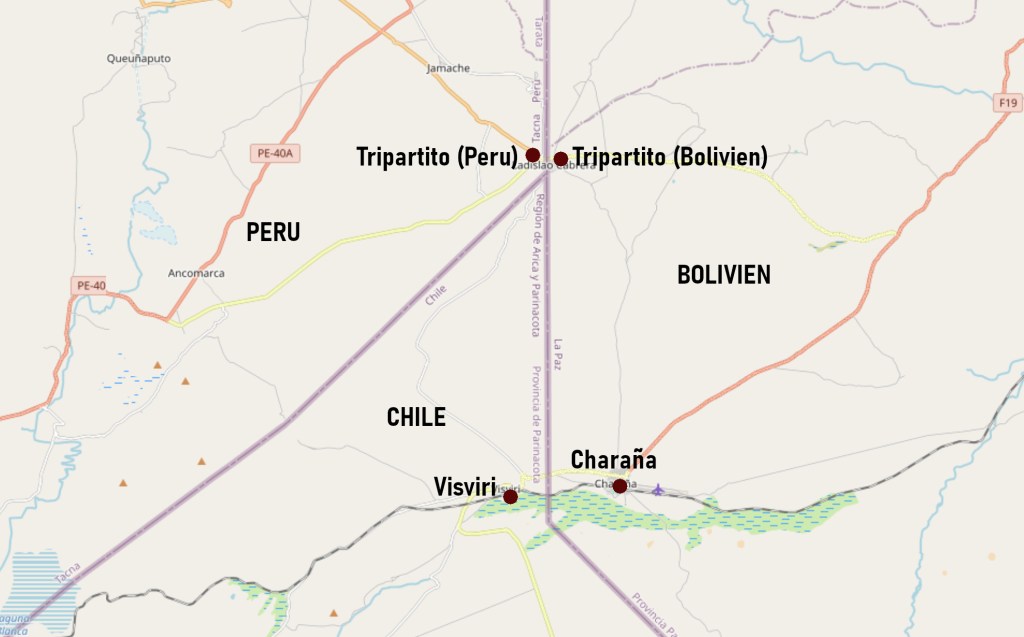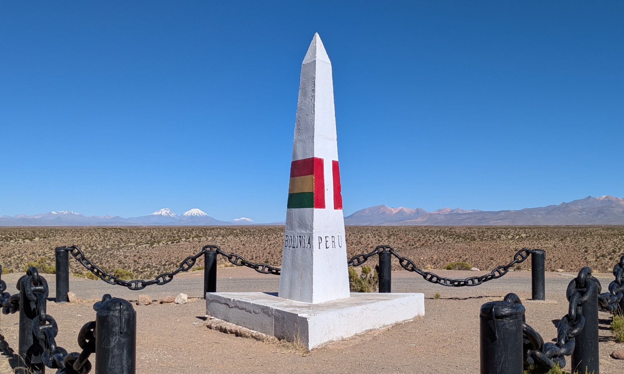 In Tripartito ist meine Ankunft am Kontrollposten ein noch viel selteneres Ereignis als in Visviri. Ich klopfe am blauen Kontrollposten an, und es öffnet mir ein höchst erfreuter peruanischer Grenzwächter, der schon fast eine Woche lang keine Reisenden mehr gesehen hat. Fast etwas enttäuscht ist er, als ich ihm berichte, dass ich nur 20 Minuten in Peru war und nun zurück nach Bolivien gehe. Etwas scheinheilig frage ich, ob dennoch eine Kontrolle nötig sei (offensichtlich ist sie das nicht, aber ich hätte gern einen Stempel). Der Peruaner aber steigt darauf ein und findet, auch wenn dies strenggenommen nicht notwendig sei, mache er es doch sehr gerne. Die Ein- und Ausreisekontrolle erledige er gleich auf einmal. So bekomme ich gleich zwei Stempel und muss nochmals zwei Passagierformulare ausfüllen, ich bin ja in beide Richtungen ein imaginäres Auto.