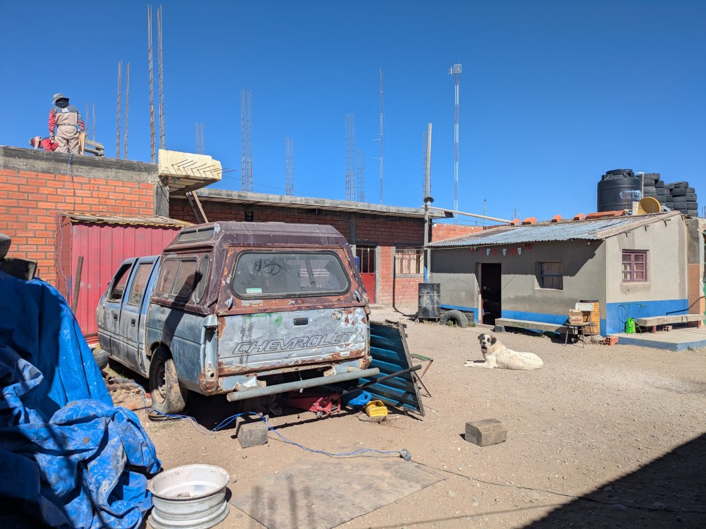 Natürlich hat die Billigkeit ihren Preis. Ich staune nicht schlecht, als ich die Adresse erreiche: das Hotel schaut eher aus wie ein Schrottplatz. Tatsächlich ist es gleichzeitig auch eine Reifenwerkstatt (Llantería), in deren Innenhof sich drei Zimmer befinden: das Hotel. Der freundliche Besitzer geleitet mich zum mittleren davon, das mich auf den ersten Blick doch etwas erschreckt: es gibt keine Bettwäsche, der Verputz hängt von der Decke, vor den beiden Betten ist ein Motorrad abgestellt. Das Zimmer lässt sich nicht abschliessen, meine Frage nach einem Schlüssel quittiert der Besitzer mit der Bemerkung: „Du wirst wohl kein Gold im Rucksack haben.“ Unnötig zu erwähnen, dass sich das WC hinter den Schrottautos im Innenhof befindet. Eine Heizung gibt es nicht, wie üblich in den Anden, auch wenn das Thermometer nachts deutlich unter den Nullpunkt fällt.