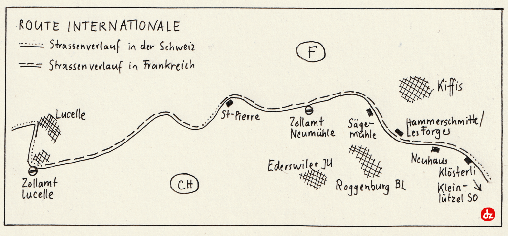 Etwa ein Drittel dieser Strecke führte mich entlang der Route internationale im Lützeltal. Die internationale Strasse ist eine zu Unrecht ziemlich unbekannte geografische Anomalie der Schweizer Landesgrenze. Zwischen dem Weiler Klösterli im Kanton Solothurn und dem Weiler Lucelle verläuft die Strasse entlang der Landesgrenze und überquert diese fünf- oder sechsmal, befindet mehrheitlich aber auf der französischen Seite. Für abgelegene Juradörfer wie Ederswiler JU oder Roggenburg BL ist sie die schnellste Verbindung mit der Aussenwelt, aber auch der schnellste Weg aus der Ajoie nach Basel.