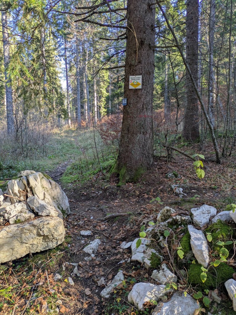 Die 11. Etappe der Wanderung begann traumhaft. Völlig allein bewegte ich mich auf dem Sentier des Bornes (Grenzstein-Weg), trotz strahlendem Sonnenschein war der Morgen frostig. Hier gibt es über viele Kilometer einen Wanderweg direkt auf der Grenze. Ausser ein paar Kühen auf der französischen Seite begegnete mir niemand, denn die Gegend ist ausgesprochen abgelegen. Informationstafeln erzählen die Geschichte dieser Grenzregion. Etwa, dass früher (also im 17. Jh.) Inspektionsgänge auf diesem Weg durchgeführt wurden, um die richtige Platzierung der Grenzsteine zu überwachen. Von beiden Seiten mussten stets zwei Generationen teilnehmen: die ältere um zu bezeugen, dass die Steine schon immer dort waren, die jüngere um zu lernen wo sie sind.