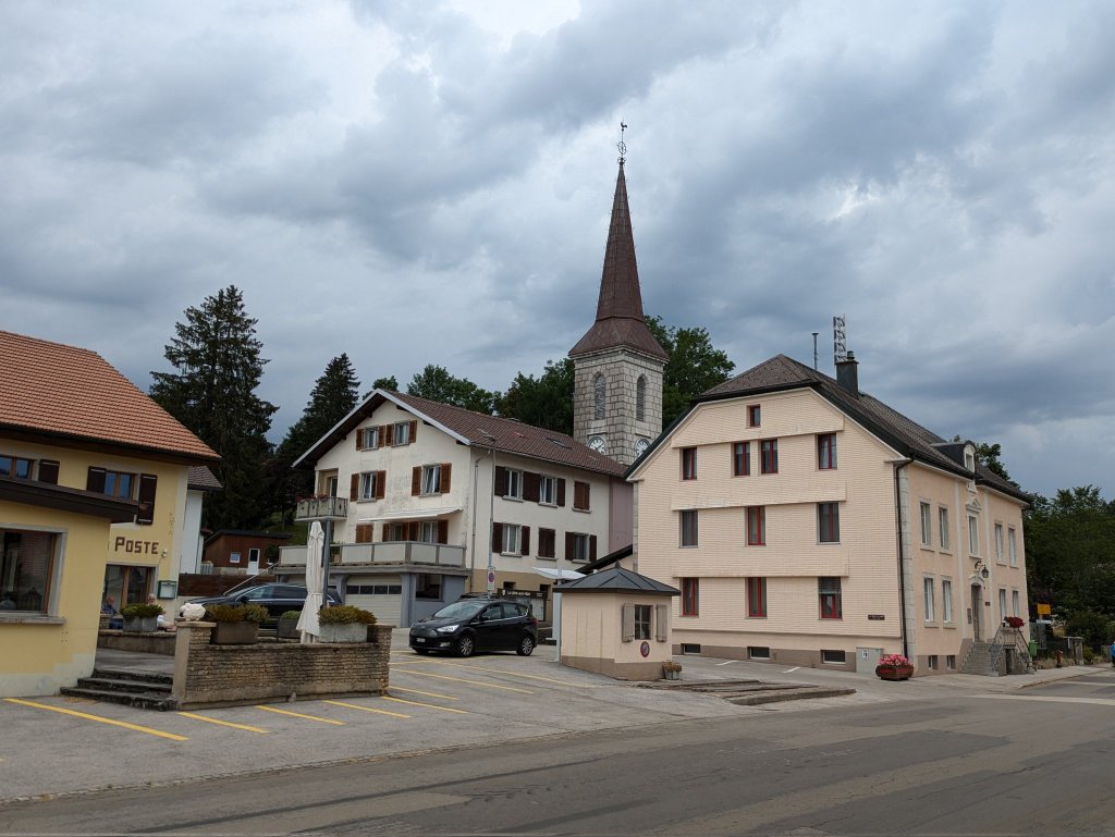 Über einsame Hügel ging es weiter ins kleine Neuenburger Dorf La Côte-aux-Fées. Erstaunlicherweises waren zwei Restaurants geöffnet. Ich nutzte die Chance für eine Pause, der Rest der Wanderung versprach nämlich wieder viel Einsamkeit.