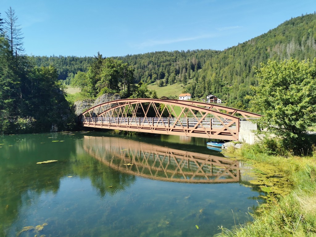 Links Frankreich, rechts die Schweiz: Grenzbrücke über den Lac de Biaufond