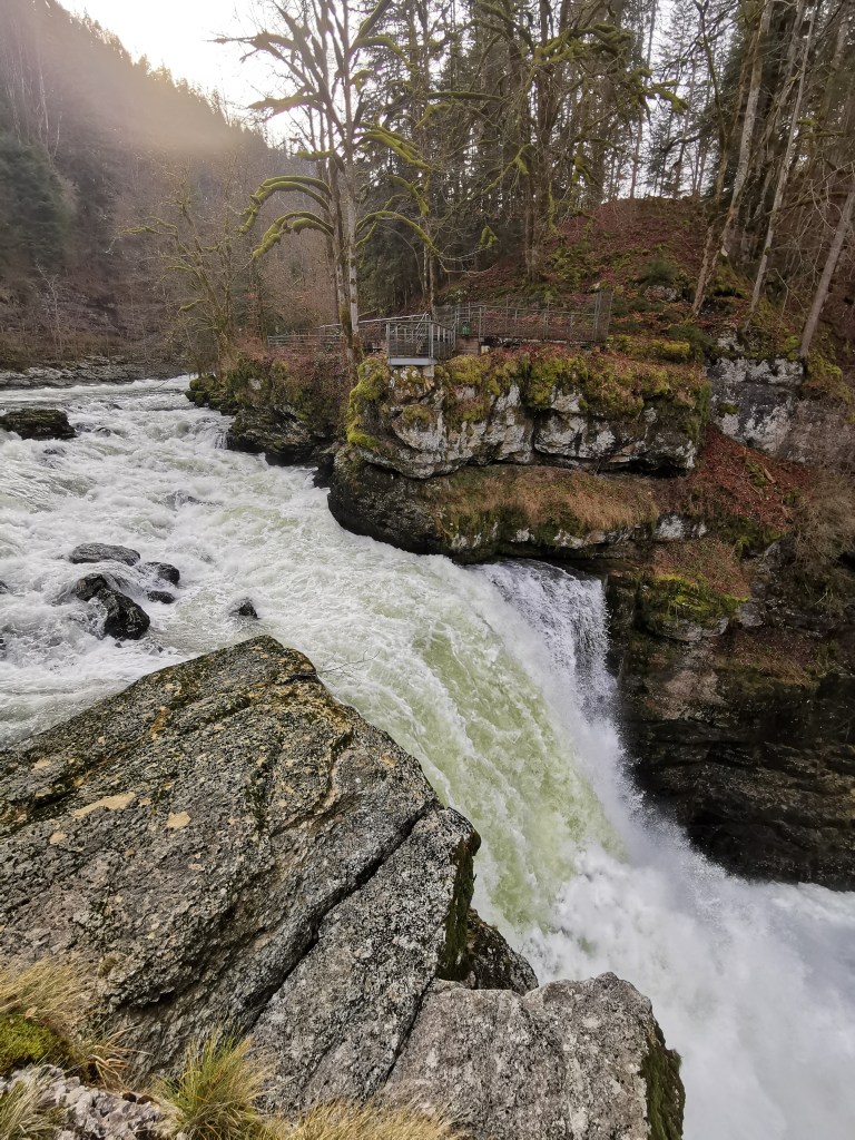 Um acht Uhr war ich in La Chaux-de-Fonds aufgebrochen, im Winter fährt nämlich kein Bus hinunter zur Grenze. Passender Name meines heutigen Einstiegspunkts: Chez Bonaparte. Damit habe ich um zwei Kilometer beschissen, die letzte Etappe hatte ich in Maison-Monsieur beendet, aber hej: dafür bin ich die sechs Kilometer von La Chaux-de-Fonds in die Schlucht hinuntergelaufen, und mit zwei Kilometern weniger Langeweile konnte ich leben. Geschlagene fünf Stunden war ich unterwegs, bis ich endlich auf einen Grenzübergang stiess: Beim Saut du Doubs (Doubs-Wasserfall) gibt es eine Fussgängerbrücke hinüber nach Frankreich. Touristen können von Aussichtsplattformen beidseits der Grenze auf die tosenden Wassermassen starren, aber nicht heute, da war auch kaum jemand unterwegs.