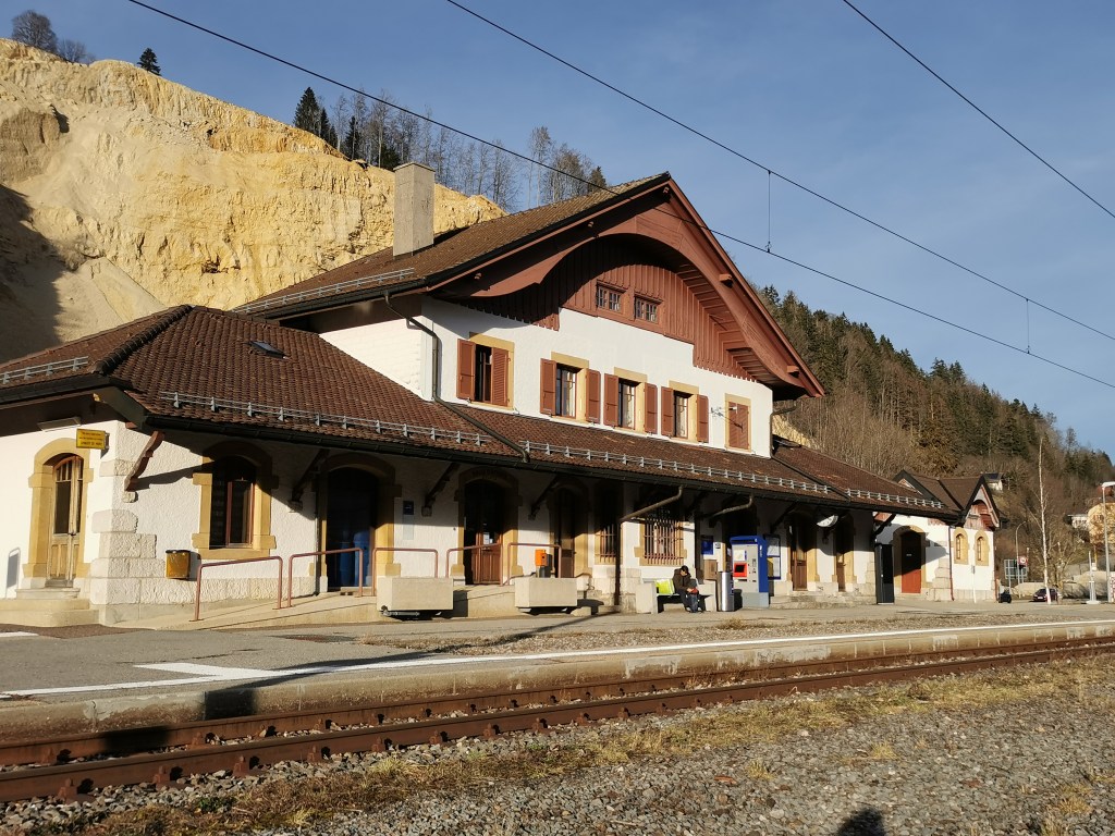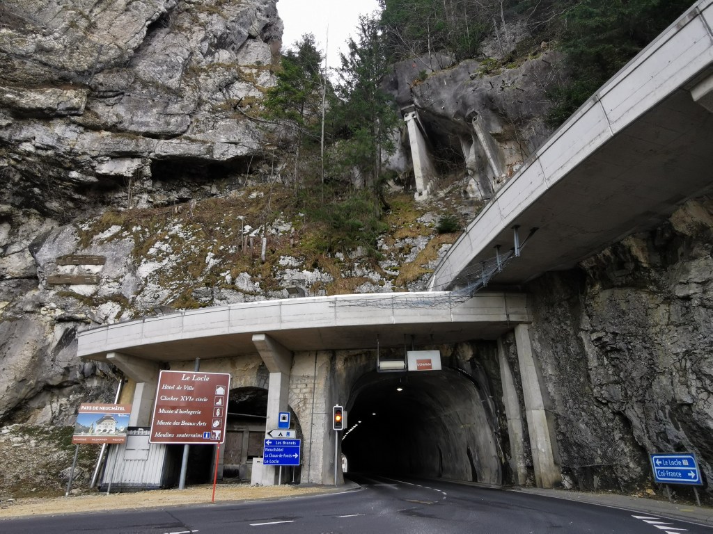 Ein noch grösseres Highlight ist der Col-des-Roches. In der Mitte steht ein steinerner Hahn, natürlich für die Französische Republik, aber auf schweizerischem Boden: Ein Denkmal für im Weltkrieg getötete Soldaten. Im Rücken des Hahns stürzt eine Felswand hinunter in die Schlucht, in die drei restlichen Richtungen führen Tunnels durch die Felsen: Rechts nach Les Brenets, links (und bereits auf französischem Boden) nach Villers-le-Lac und gegenüber des Güggels nach Le Locle. Doch damit nicht genug: Auch ein Bahntunnel durchquert die Felsbarriere, und selbst der Bach Le Bied, der in der Nähe von Le Locle entspringt, hat sich einen unterirdischen Weg durch den Karst gebahnt und heisst nach seiner Wiedergeburt auf der französischen Seite Rançonnière. Bemerkenswerterweise hat die lokale Bevölkerung in diesen unterirdischen Flusslauf unterirdische Mühlen eingebaut und über Jahrhunderte betrieben – der legendäre dänische Märchenautor Hans Christian Andersen war bei seinem Besuch vor 150 Jahren beeindruckt. Heute kann man sie im Rahmen touristischer Exkursionen besichtigen, aber nicht heute (immerhin muss man nicht bis im Sommer warten: Wiedereröffnung 2. Januar), und überhaupt freute ich mich auf die gute Zugsverbindung vom schmucken Bahnhof Le-Locle Col-des-Roches (das längste Bahnhofsschild der Schweiz?) mit dem pünktlichen (!) TER nach La Chaux-de-Fonds und heim nach Bern.