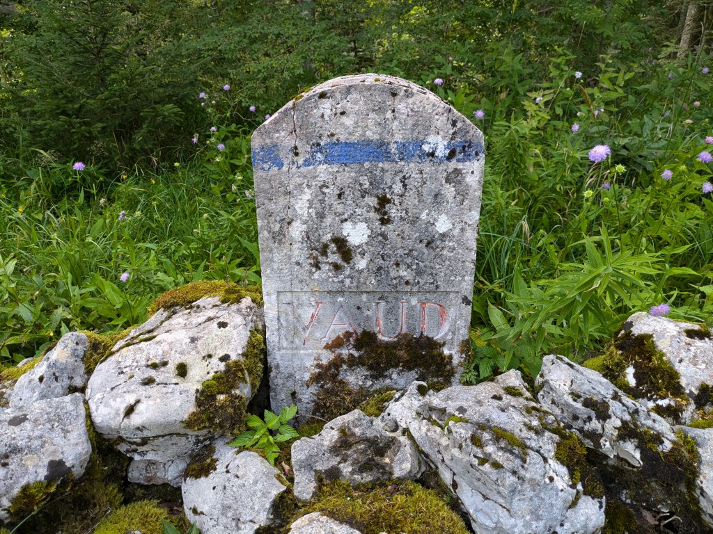 Das Dreiländereck Frankreich-Neuchâtel-Waadt betrachtete ich nur aus der Ferne. Einerseits ereilte mich ein heftiger Regenguss, der den Abstecher ins hohe Gras wenig reizvoll machte. Andererseits war der Grenzstein von Kühen umlagert, die ich ungern störte. Im Dreiländereck beginnt die Nummerierung der Grenzsteine wieder bei 1 und sie sehen ganz anders aus als in Neuchâtel. Einer der ersten waadtländischen Grenzsteine: