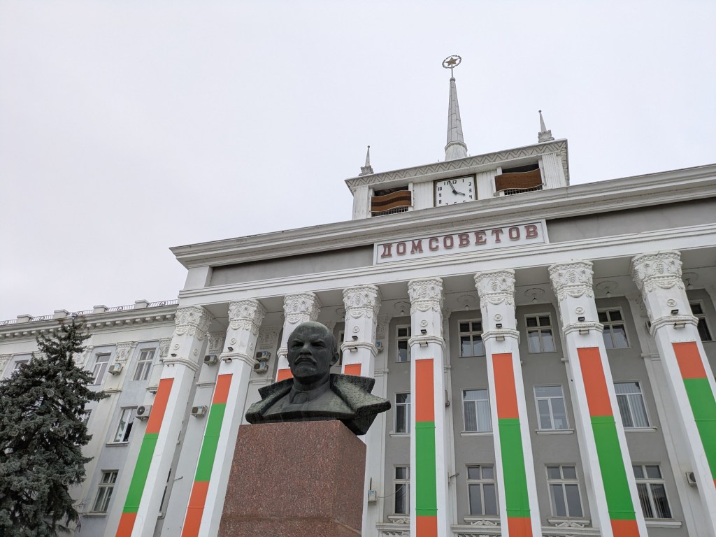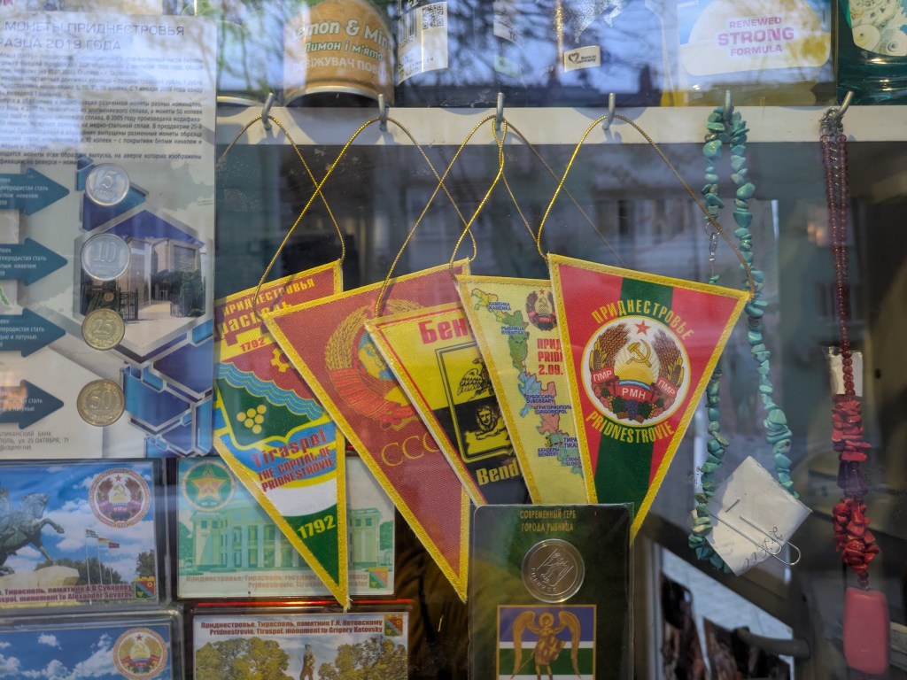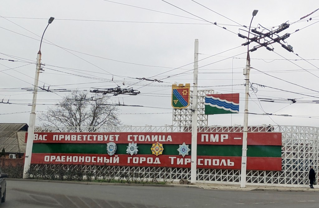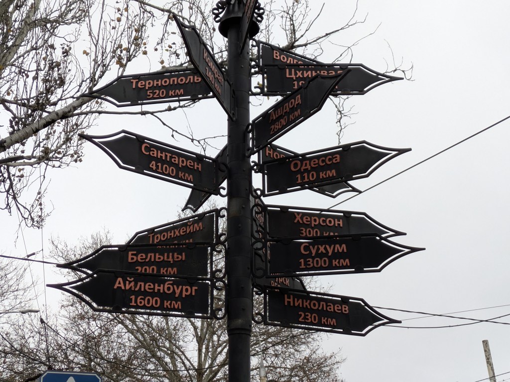 An einer zentralen Kreuzung zeigt ein Wegweiser in die Partnerstädte Tiraspols. Suchumi ist dabei, die Hauptstadt Abchasiens, ebenso das südossetische Zchinwali. Auch eine moldauische Partnerstadt gibt es: Bălți, die zweitgrösste Stadt des Landes und fast ebenso russophil wie Tiraspol (aber deutlich deprimierender, ich habe sie dann auch noch besucht). Eindrücklich zu sehen ist aber, dass es ins ukrainische Cherson nur 300 Kilometer sind. Cherson, wo Russland mit Drohnen Jagd auf Zivilisten macht…