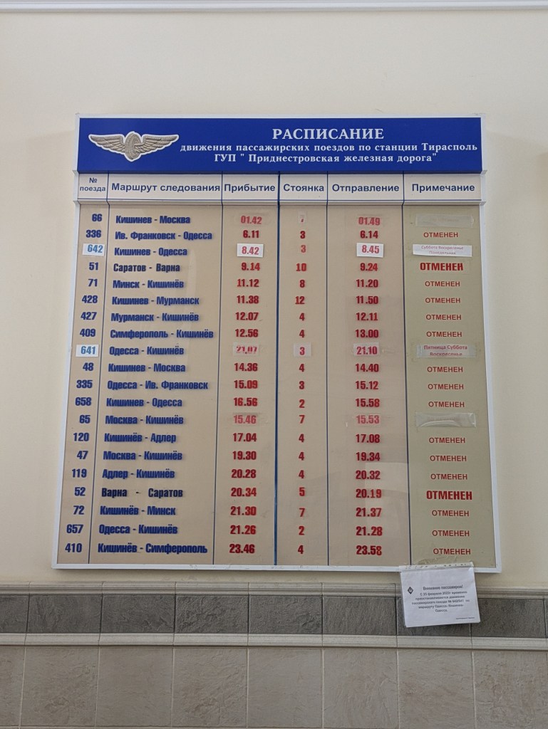 Zum ersten Mal wird die neue geopolitische Realität sichtbar an der Abfahrtstafel des Bahnhofs. Verheissungsvolle Ziele listet sie auf: Varna am Schwarzen Meer, Adler (bei Sotschi), Murmansk, Simferopol, Saratow… Doch zu jedem Zug steht das Wort «Отменен» (gestrichen). Einzige Ausnahme ist der Zug Nr. 641/642, der zuletzt noch freitags und am Wochenende zwischen Chişinău und Odesa verkehrte. Ein unten an die Abfahrtstafel angehänger Computerausdruck erklärt aber, dass ab dem 25. Februar 2022 auch dieser Zug nicht mehr verkehrt: die Ukraine schloss die Grenze zum prorussischen Transnistrien.