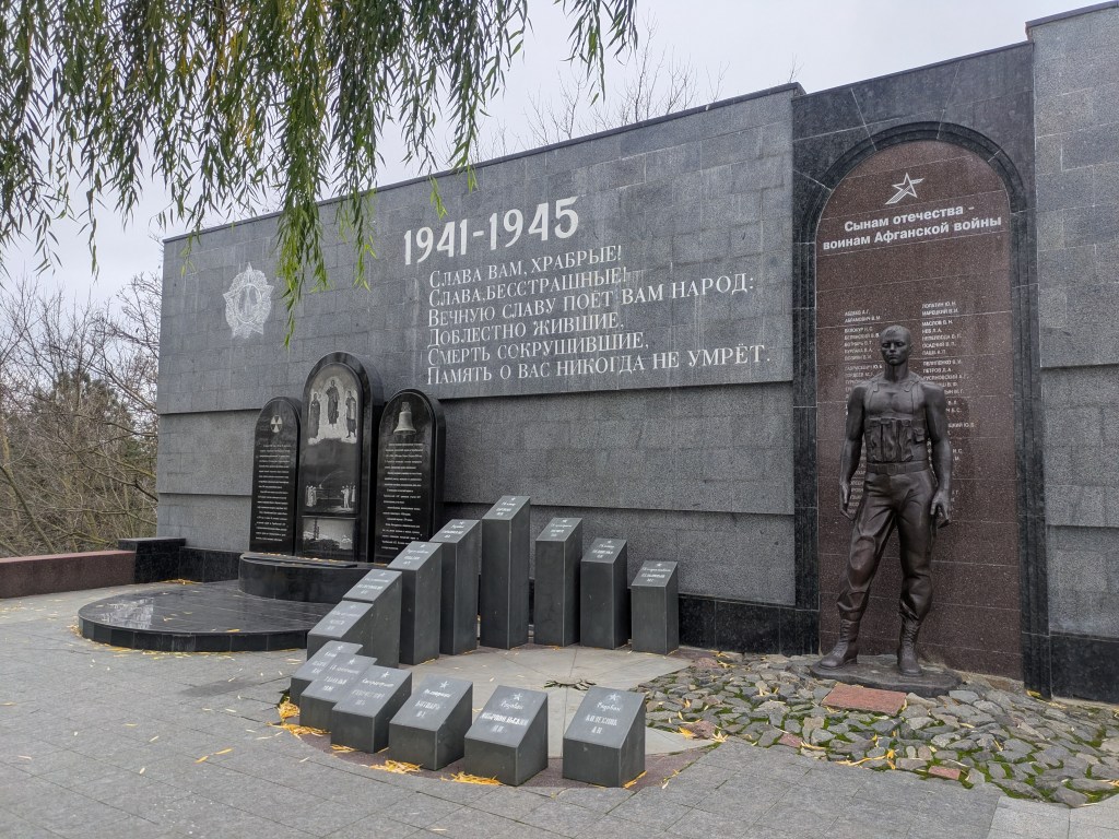 Neu ist auch diese Erinnerungsstätte für den Grossen Vaterländischen Krieg, wie der Abschnitt 1941 bis 1945 des Zweiten Weltkriegs in der Ex-Sowjetunion genannt wird. Das war schon in der Sowjetzeit ein grosses Ding, doch in den letzten 15 Jahren überbordet in Russland der Gedenk-Kult um den Sieg über den Faschismus komplett. So wie es aussieht, musste nun auch Transnistrien nachziehen. Eigentlich handelte es sich nämlich um die Gedenkstätte für die Gefallenen im Afghanistan-Krieg (das ist der Soldat rechts), davor befindet sich das Memorial für den transnistrischen Unabhängigkeitskrieg.