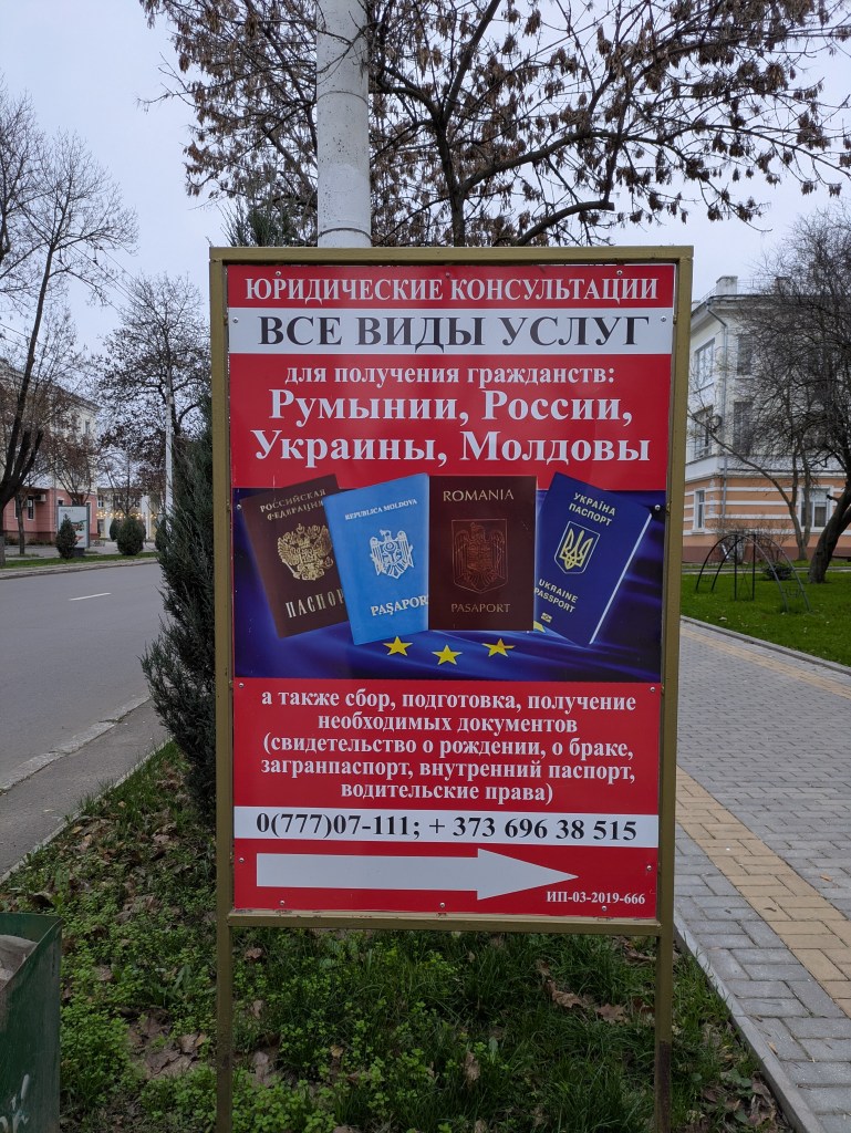 Kein Wunder also, ist die Nachfrage nach anderen Staatsangehörigkeiten gross. Am zentralen Oktober-Propekt werben Agenturen ganz offen damit, Pässe für die Einwohner des Paria-Staats einzuholen. Gleich vier stehen zur Auswahl: Moldova, Rumänien, die Ukraine und Russland. Die Dienstleister helfen nicht nur dabei, den Passantrag auszufüllen, sondern auch die notwendigen Unterlagen aufzutreiben. Besonders attraktiv ist der rumänische Pass, der die Arbeitsnahme in der ganzen EU möglich macht. Für die meisten Moldauer ist er einfach zugänglich, da das Gebiet Moldovas zwischen den beiden Weltkriegen zu Rumänien gehörte und dieses die Nachkommen der damaligen Einwohner weiterhin als rumänische Staatsangehörige ansieht. Für Transnistrien gilt dies nicht, denn es war damals Teil der Ukrainischen Sowjetrepublik. Doch es ist ein offenes Geheimnis, dass in dieser Hinsicht nichts unmöglich ist. Schon für 3000 € können diese Agenturen die notwendigen Unterlagen beschaffen.