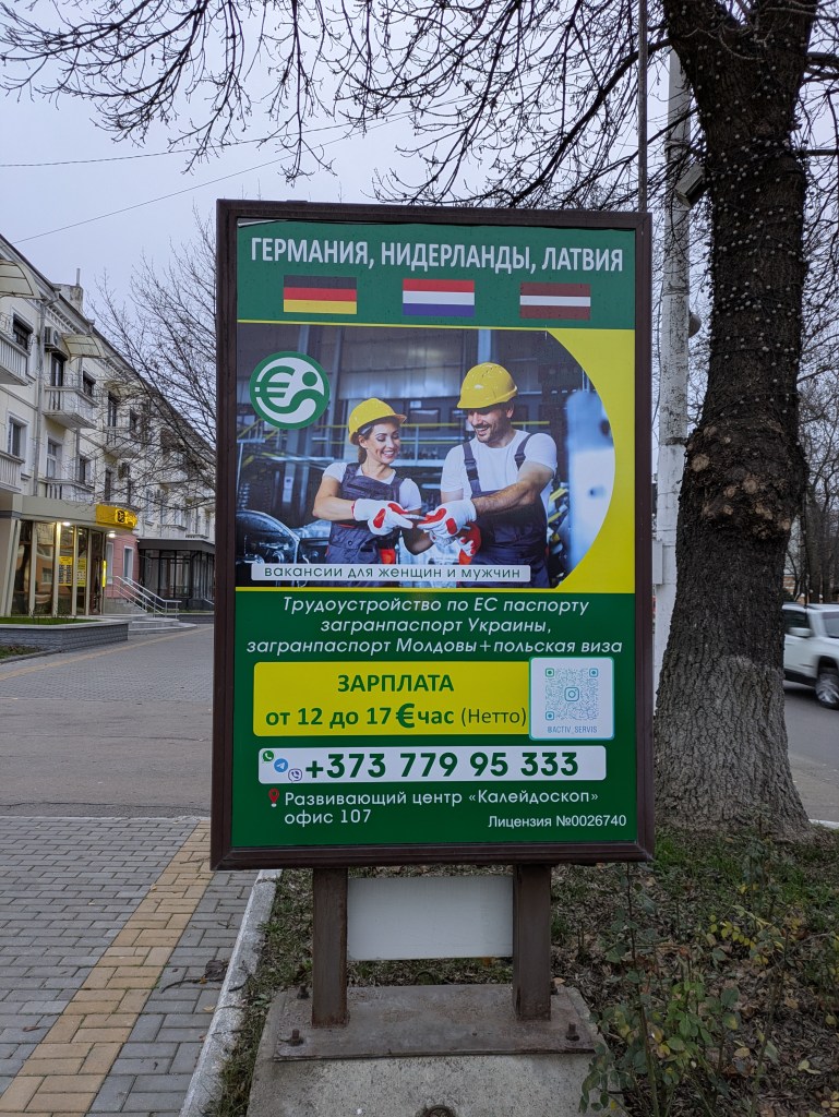 Dass sich dies lohnt, davon zeugen die Werbetafeln auf der anderen Seite der Strasse (und auch sonst überall in Transnistrien und Moldova). Sie werben für Arbeit in Deutschland, Lettland, Frankreich, Israel, mit verheissungsvollen Löhnen. Nicht wenige lassen sich davon verlocken. Zum Zeitpunkt der «Unabhängigkeit» hatte Transnistrien über 600 000 Einwohner, heute sind davon noch etwa 350 000 übrig. Moldova verzeichnete einen ähnlichen Rückgang. Nicht alle dieser Arbeitsangebote sind seriös: Moldova führt europaweit die Menschenhandels-Statistik an.
