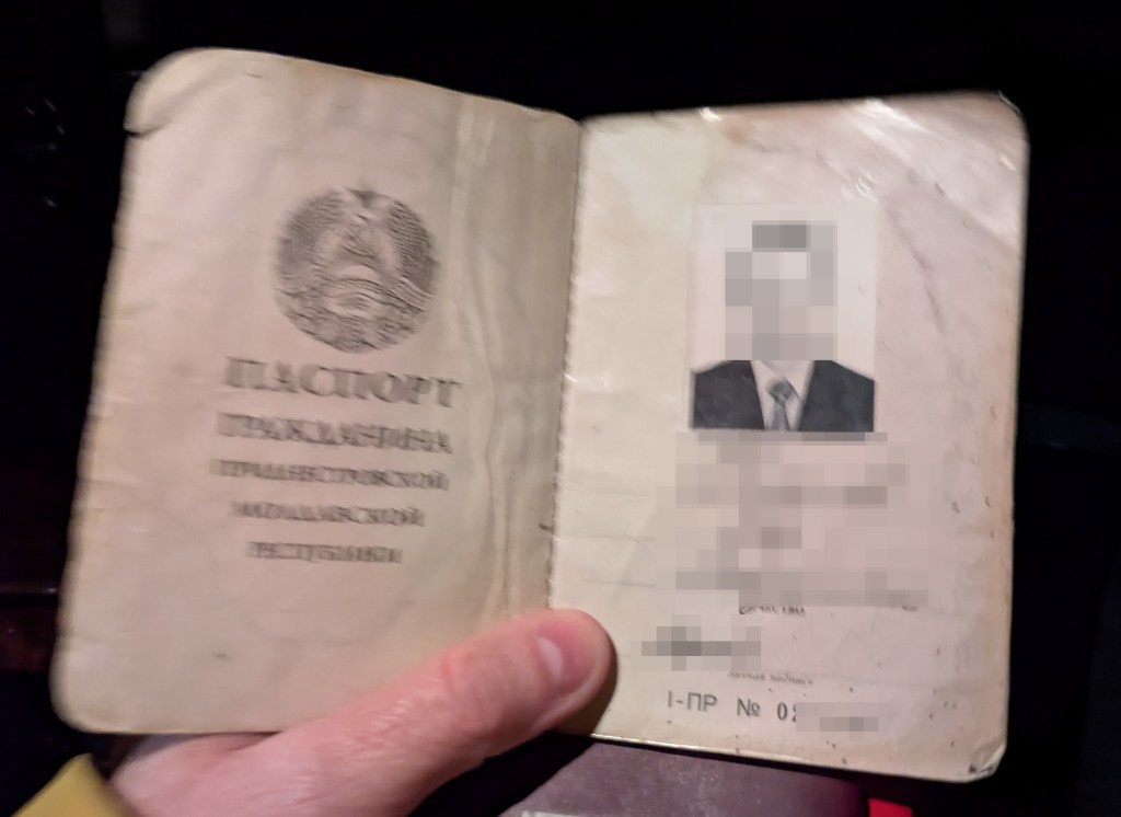 Transnistrien stellt eigene Pässe aus. An der Grenze erlaubte mir unser Fahrer, seinen zu fotografieren. Er machte sich über den Pass lustig: «Sieht aus wie jener der Sowjetunion». Das ist nicht so weit hergeholt: Bis 2001 stellte Transnistrien Pässe der Sowjetunion aus, bis endlich ein eigener Pass mit fast demselben Layout eingeführt wurde. Weit kommt man damit nicht: nur nach Moldova kann man reisen, früher auch in die Ukraine; vereinzelt gibt es Berichte von erfolgreichen Reisen nach Russland.