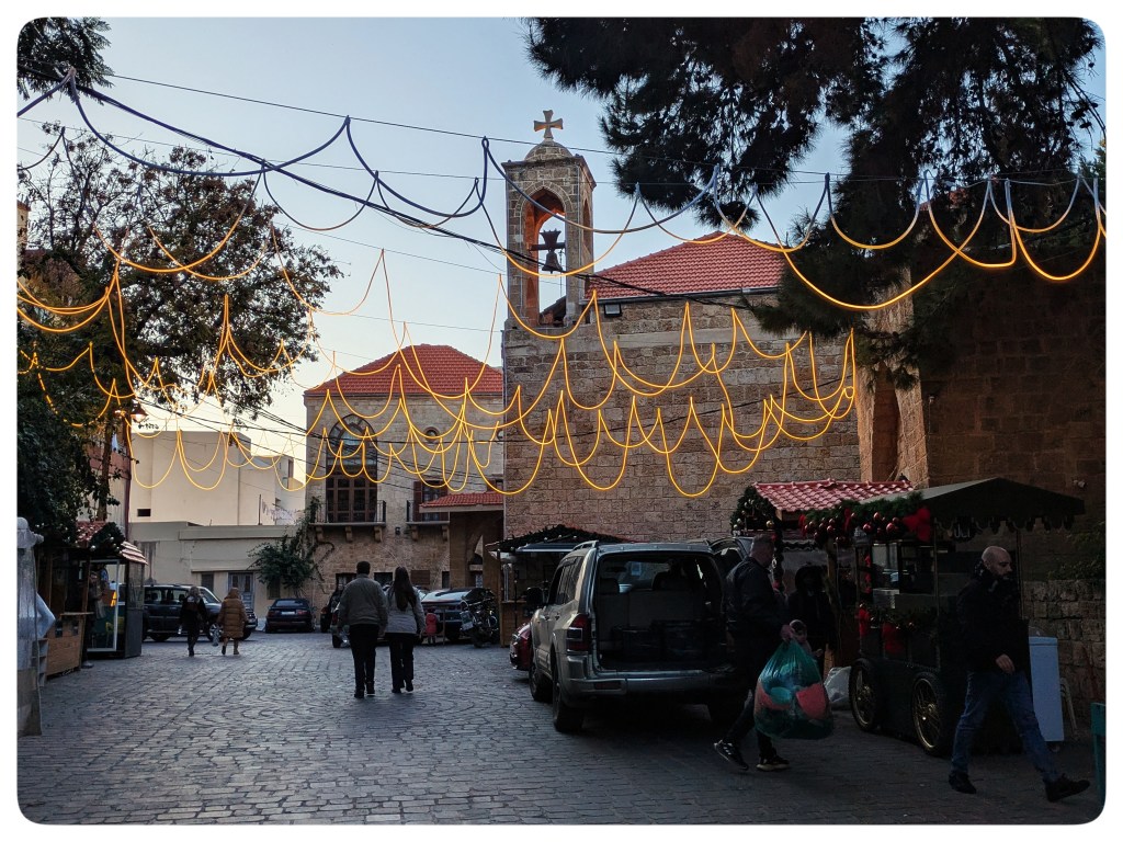 Autobahn nach Norden. Libanon ist ein ausgesprochenes Autoland. Der Anfang eines öffentlichen Busnetzes wurde nun endlich geschaffen, die Eisenbahn ist im Bürgerkrieg kaputtgegangen und wurde nie wieder aufgebaut. Da Libanon sehr dicht besiedelt ist, gibt es ständig Stau.Batroun. Die libanesische Flagge an einem Fischerboot im Hafen.Batroun. Bemerkenswert dezente Weihnachtsdeko. Normalerweise ist sie in Libanon deutlich kitschiger, als wir uns in Mitteleuropa gewöhnt sind.Batroun. Momentan ist es zu kalt zum Baden, aber zum in der Sunne herumsitzen und gut Essen und Trinken reicht es.Libanon. Sonnenuntergang im Mittelmeer.Beirut, Achrafiye. Feierabendverkehr nach Sonnenuntergang.