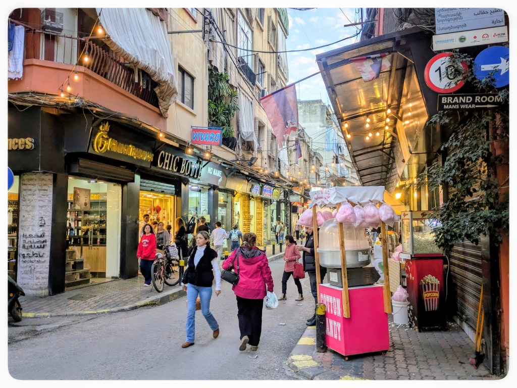 Beirut, Achrafiyeh. Fühlt sich wie in Europa an: Boutiquen, edle Restaurants, Hipster-Cafés, Street Art. Am Abend verwandelt sich die Hauptstrasse in eine Partymeile.Beirut, Stadtzentrum. Die Place de l’Etoile war bei meinem ersten Besuch vor 21 Jahren Zentrum des pulsierenden Stadtlebens (das jetzt in Achrafiye pulsiert). Heute ist der Platz verwaist, in der ganzen Zone gibt es nur zwei offene Cafés. Nach den Protesten 2020 war das Stadtzentrum jahrelang abgesperrt. Jetzt ist es wieder offen, aber niemand geht hin.Beirut, Bachoura. Wenige hundert Meter von den Malls im Stadtzentrum wirkt dieses schiitische Viertel fast wie eine Konfliktzone mit Hisbollah-Flaggen, Märtyrer-Plakaten und aufgehängten Slogans.